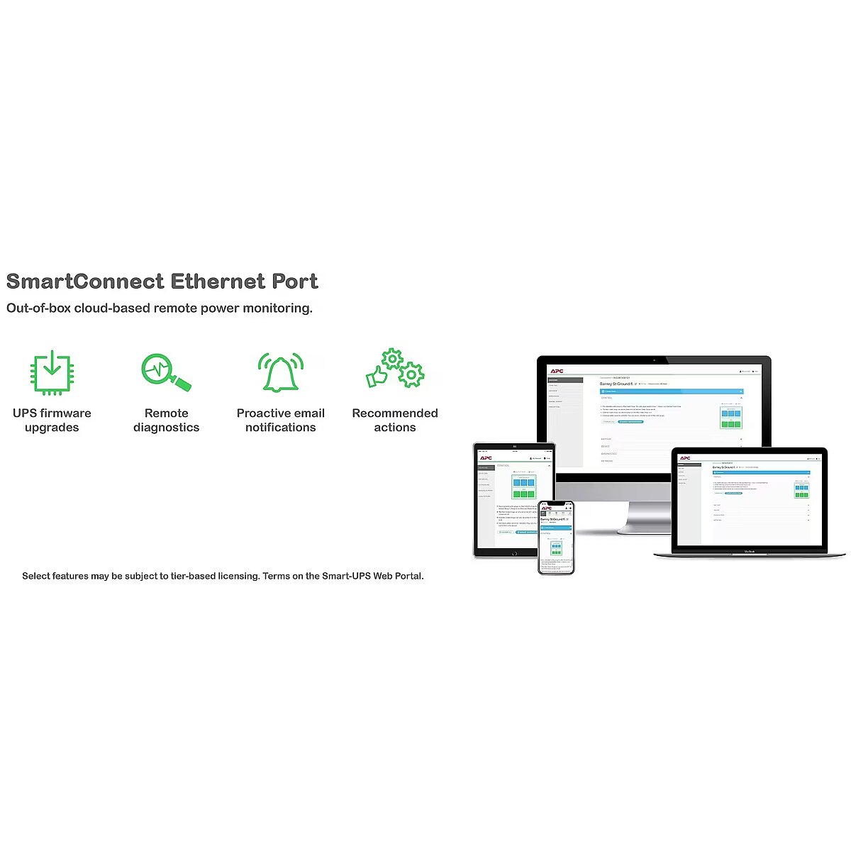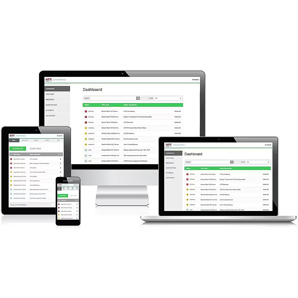 APC SmartConnect - a function that allows you to view the UPS status via a secure internet portal. Thanks to the innovative remote monitoring interface you will receive automatic notifications, firmware updates and advanced support. The easy-to-use APC SmartConnect network communication provides additional value - and even more important - peace of mind.