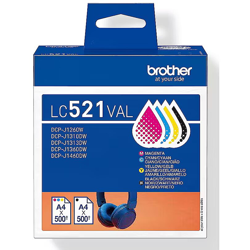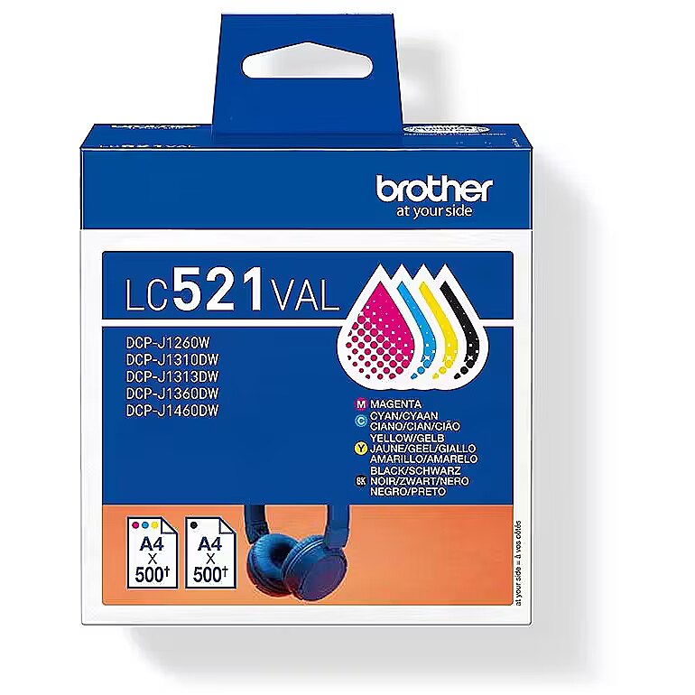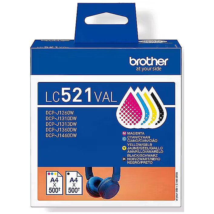 LongSummaryDescription - Brother LC521VAL Genuine Ink Cartridge Value Pack. Supply type: Multi pack, Colour ink page yield: 500 pages, Printing colours: Black, Cyan, Magenta, Yellow, Quantity per pack: 4 pc(s), Black ink page yield: 500 pages