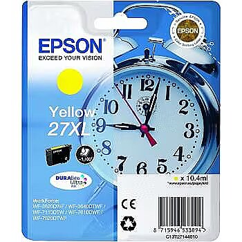 LongSummaryDescription - Epson Alarm clock Singlepack Yellow 27XL DURABrite Ultra Ink. Colour ink type: Pigment-based ink, Cartridge capacity: High (XL) Yield, Colour ink page yield: 1100 pages, Colour ink volume: 10.4 ml, Printing colours: Yellow, Quantity per pack: 1 pc(s)