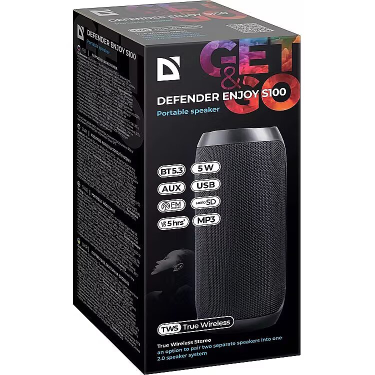Description - Defender Enjoy S100 Bluetooth Speaker Black. Portable Bluetooth speaker system with a built-in MP3 player and FM tuner. Supports USB flash drives and microSD memory cards.