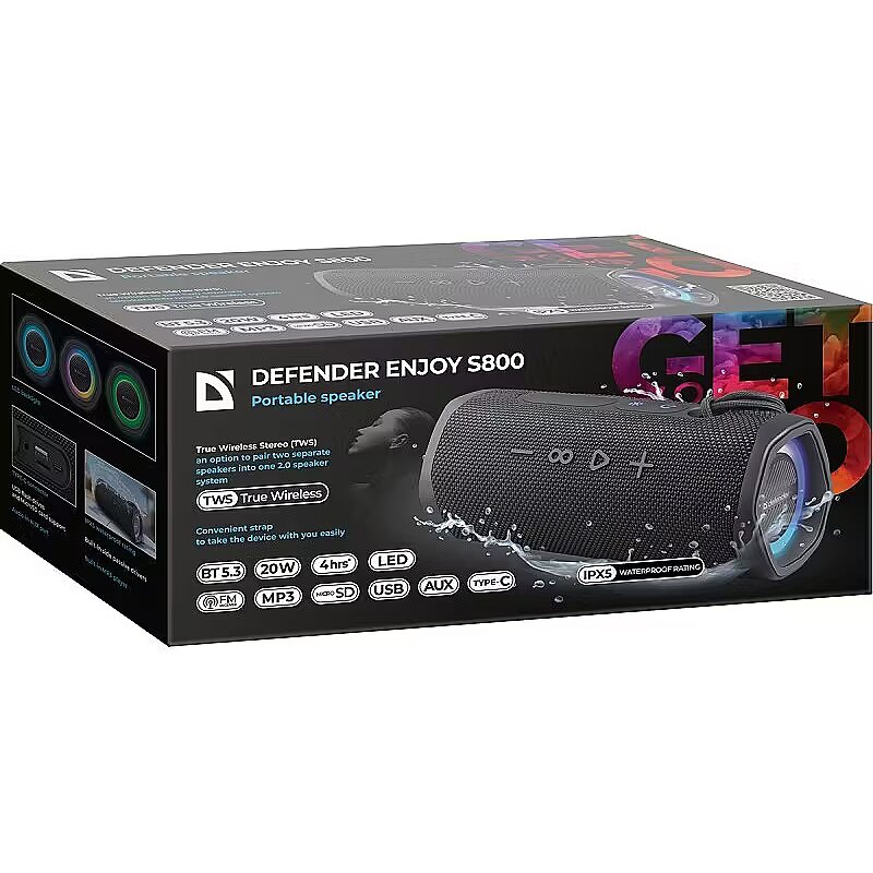 Description - The Defender Enjoy S800 20W Bluetooth Speaker is a portable speaker with Bluetooth, a built-in MP3 player, and an FM tuner. It supports USB flash drives and microSD memory cards. Thanks to the TrueWireless feature, this speaker can be paired with a speaker of the same model to create stereo sound.