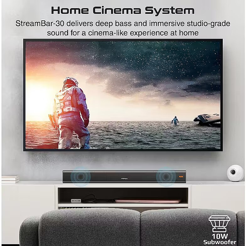 With a built-in 10W Subwoofer, StreamBar-30 delivers deep bass and immersive studio-grade sound for a cinema-like experience at home.