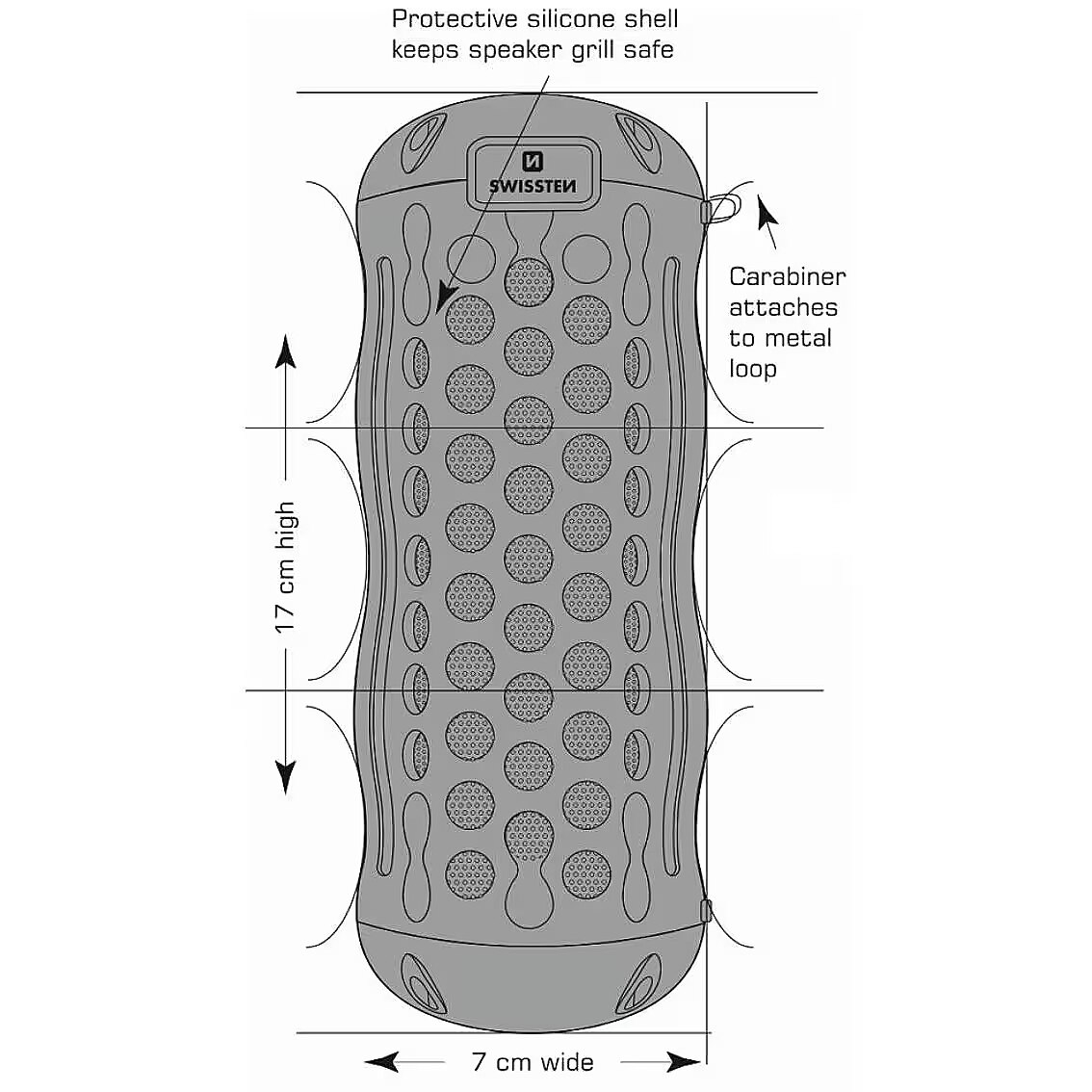 description_en - Swissten High Quality portable wireless speaker with Bluetooth / Micro SD / Water resistant IPX5 / Extra Deep Bass / Carabiner metal / Protective silicone shell keeps speaker grill safe / Take call / Output: 2x5W