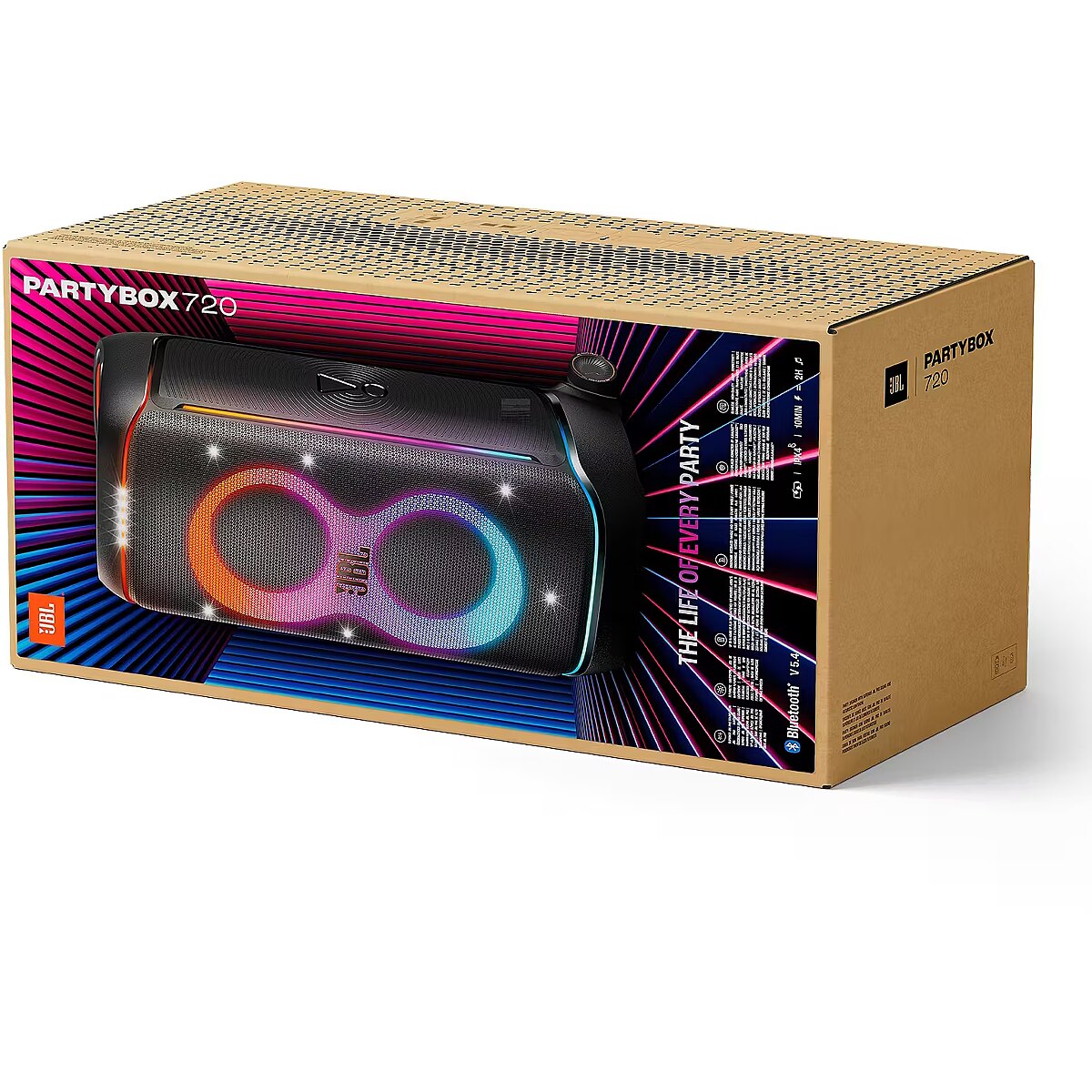 LongDesc - We bring peak party energy wherever we go with the JBL PartyBox 720. Superior JBL Pro Sound, deep bass that hits just right, and a lightshow that goes all in—starry lights, flowing trails, and pulsing strobes. With smooth wheels, a sturdy handle, and a splashproof design, we’re rolling the party everywhere we go.Superior JBL Pro SoundWe’re cranking out 800 watts of JBL Pro Sound—loud, clean, and full of deep bass from those two massive 9" woofers. The tweeters keep the highs crisp and clear, so every track hits just right and the dance floor stays packed.Futuristic lightshowMix all that epic sound with a lightshow to match—vibrant stars, flowing trails, and strobes that move with the beat. It’s a full-on vibe.Up to 15 hours playtimeKeep the music going for up to 15 hours on a single charge. Need more juice? Swap in the backup batteries (sold separately) and keep it moving. Just need a quick boost? A 10-minute fast charge gets you up to 2 extra hours of playtime.
