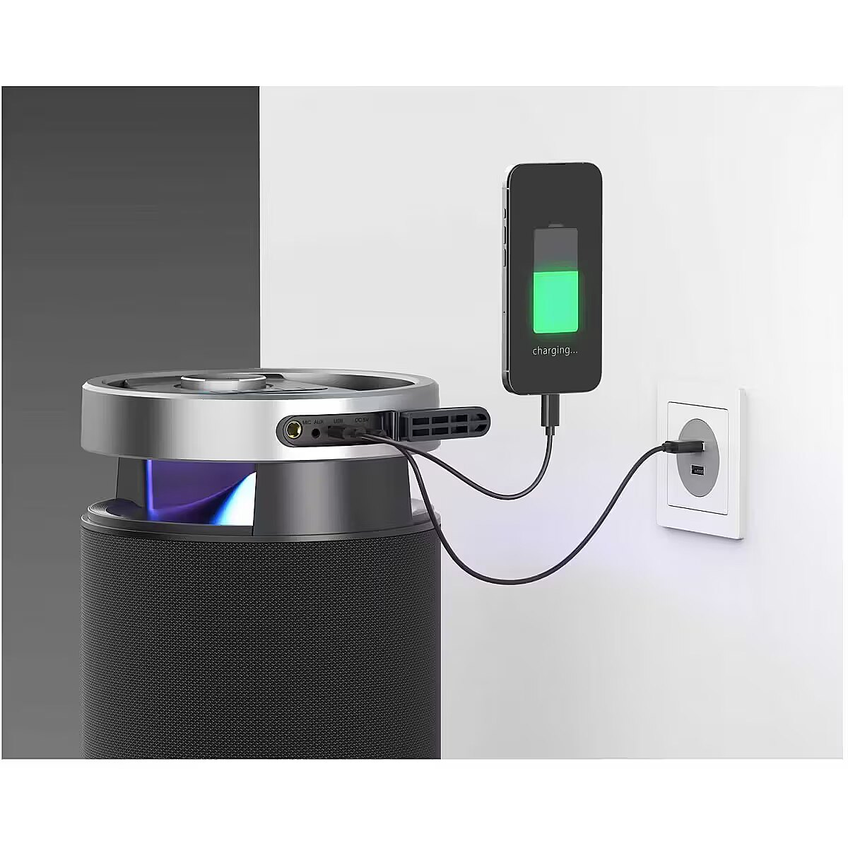 Other features - Właściwości Wodoodporny głośnik o klasie szczelności IPX5 Osłona głośnika z tkaniny premium TWS (True Wireless Stereo) podłączenie dwóch głośników Oświetlenie głośników LED i nastrojowe oświetlenie 3 tryby korektora Dźwięk: Maksymalna moc głośnika 130 W 5 głośników (1 subwoofer, 4 wysokotonowe) + 1 promiennik pasywny Pasmo przenoszenia: 20 Hz 19 kHz Całkowite zniekształcenia harmoniczne: 5% Wejścia: Bluetooth Audio 5.3 Wejście audio Aux (gniazdo stereo 3,5mm) Wejście Mic (6,3 mm Jack) Odtwarzanie z USB Funkcja powerbanku 5 V/1 A Inne: Wbudowany akumulator: 21 000 mAh Li-Ion (77,7 Wh) Czas odtwarzania wynosi do 13 godzin (przy 50% głośności) Ładowanie USB-C (obsługa PD) Czas ładowania maks. 4 godziny