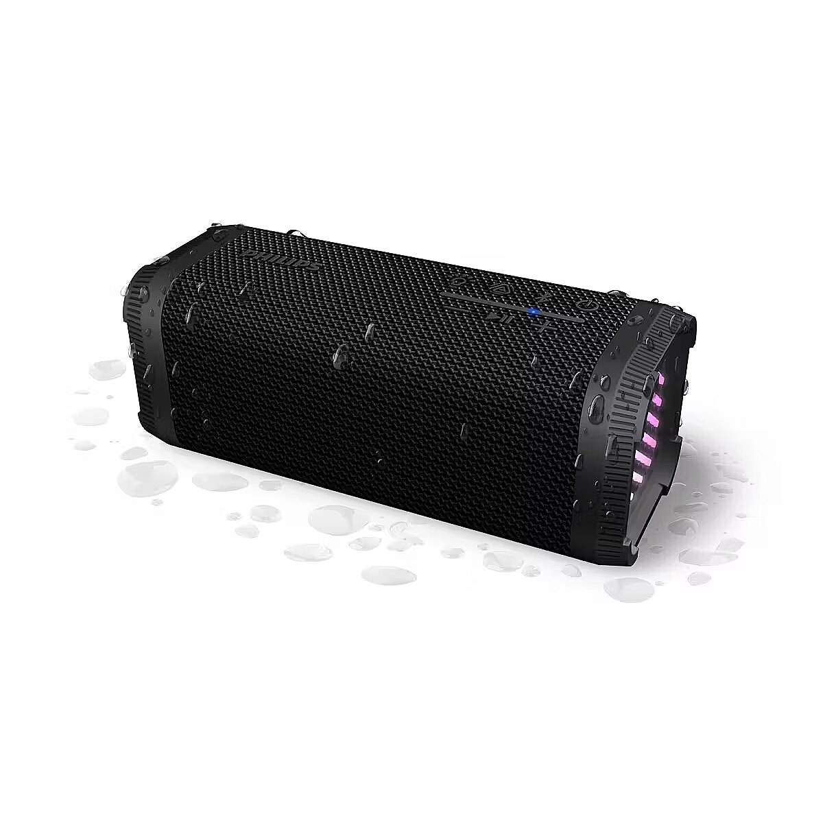 LongDesc - Get out there with the splash-proof compact speaker that gives you up to 20 hours play time on a single charge. Funky LED lights set the vibe, Bass+ delivers deep bass at any volume and you can connect to other speakers for bigger sound.Philips Entertainment app. Smart control for your speakerOur handy companion app lets you select a source, control playback and Bass+, switch between different light modes, check battery life and more. Plus, an in-app PartyLink mode makes it simple to connect to other speakers via Auracast™ for even bigger sound.GRS-certified recycled plasticWe use post-consumer recycled plastics in this product, and our packaging is plastic-free.Responsible packagingInserts are printed on recycled paper with soy-based ink, and the packaging itself is made from FSC-certified recycled cardboard.Bold sound with surprisingly deep bass at any volumeThis compact portable speaker packs a punch for its size with 20 W max (10 W RMS) of rich sound. Twin passive radiators and our exclusive Bass+ technology keep the bass deep and tight—even if you're listening at lower volumes. There's also a built-in mic, so if a call comes in you can take it hands-free.Plays long, travels easily and doesn't mind a little rainWith up to 20 hours of play time on a single charge, you can keep the tunes coming all day and into the night. The handy wrist strap makes it easy to carry this speaker, and the IPX5 splash-proof build protects it from raindrops and spills. A 30 minute charge gets you 5 hours of play time, and a full recharge takes around 2.5 hours.Bluetooth® streaming, multipoint, USB playbackPlaylists ready? Bluetooth® 5.4 brings you a steady connection for seamless streaming. Multipoint lets you connect to two Bluetooth® devices at the same time, and you can plug a portable music player or a thumb drive into the USB-A port on the speaker.TWS and Auracast™ for multi-speaker setupsWant more? You can pair with another TAS2000 speaker for True Wireless Stereo (TWS). Or go bigger and use Auracast™ to broadcast what you're playing out to other compatible speakers: the LC3 codec is supported for better sound, and setup is simple via our companion app.Beat-synced lightshow. Rainbow LEDs pulse to the musicAs the beats flow, colourful RGB LED lights pulse over and around the twin passive radiators. There are five different light modes to choose from. Simply press the light button on the speaker or use our companion app to get started—and let everyone know you came to party.