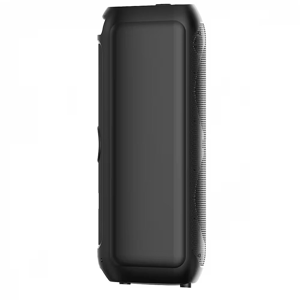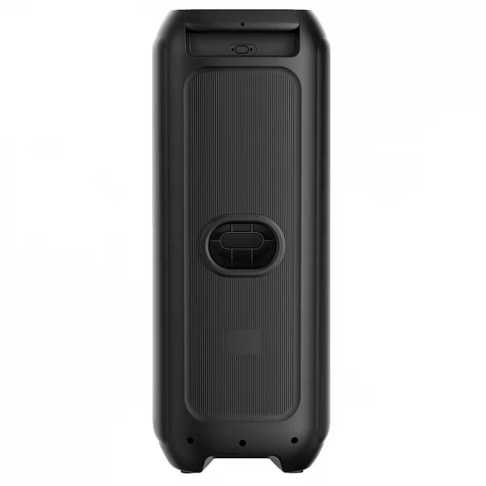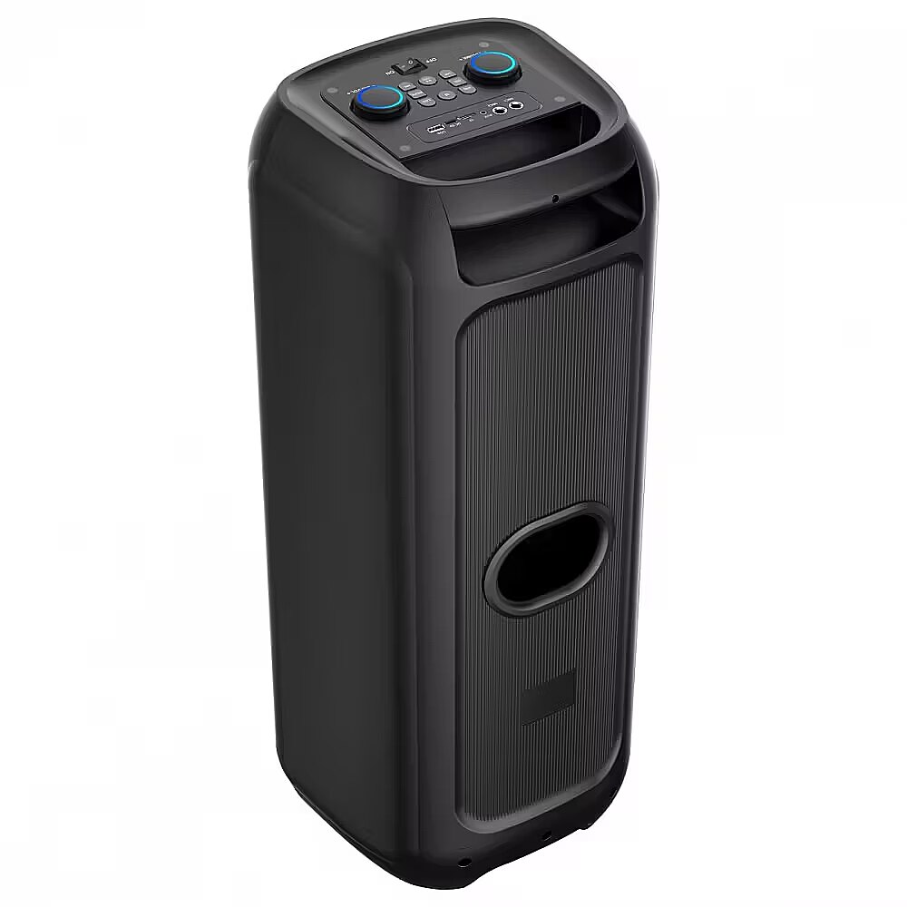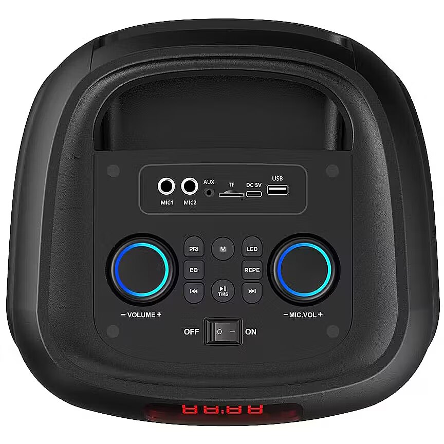 Other features - Power: RMS 120W / PMPO 1400W. Drivers: Two 8-inch speakers. Frequency Response: 100 ~ 20,000 Hz. Bluetooth: Version 5.3 + EDR with A2DP and AVRCP profiles. TWS (True Wireless Stereo): Wireless connection support for two identical speakers. FM Radio: Built-in with auto-scan (87.6108 MHz). Power Supply: 5V via USB-C cable. Battery: Built-in Lithium-ion, providing up to 11 hours of operation. Connectors and Slots: MP3 player with microSD card and USB storage support. AUX input. Two 6.3 mm jack microphone inputs with independent volume control for Karaoke. Control: Main volume control, Equalizer, and an included remote control. Display: Informative LED display.
