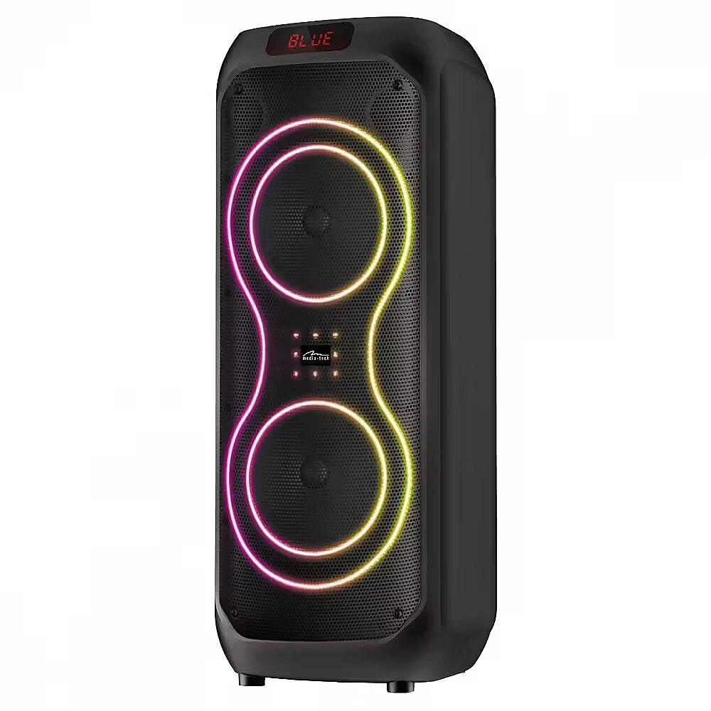 Description - Media-Tech POWER AUDIO MAX MT3185 is a powerful, mobile audio system with 120W RMS power, designed specifically for parties and karaoke. Equipped with two 8-inch speakers, it offers dynamic sound and modern connectivity features within a rugged housing. High Power: 120W RMS (1400W PMPO) ensuring crystal-clear sound and deep bass. Connectivity: Bluetooth 5.3 + EDR, FM radio with auto-tuning, and TWS function (allowing two identical speakers to be paired wirelessly into a stereo set). Entertainment: Karaoke function with two microphone inputs (6.3 mm) and independent volume control. Multimedia: MP3 player with microSD and USB support, plus an AUX input. Mobility: Built-in rechargeable battery (up to 11 hours of operation), USB-C charging (5V), and a weight of 5.4 kg. Design: LED display, striking lighting effects, and an included remote control. Applications: Perfect for house parties, outdoor events, fitness classes, or as a sound system for your TV/computer.