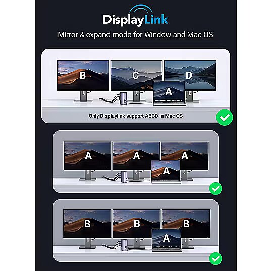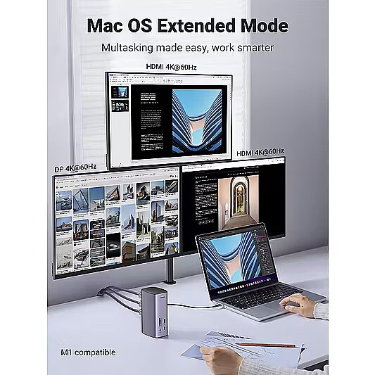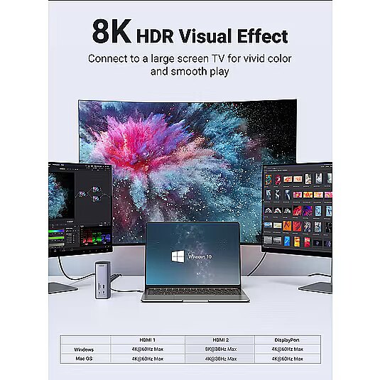 LongDesc - 8K Crystal-clear Streaming Dock StationUSB C docking station HDMI2 port supports up to 8K@30Hz in Windows, and up to 4K@60Hz in Mac OS.Connect via all three simultaneously to enjoy crystal-clear streaming or mirroring across 3 displays.UGREEN Docking Station Expansion Mode and Mirror Mode ,Increase Your Display OptionsStop wasting time switching back and forth between programs or documents—extend your display across multiple monitors via any 3 of displays for an easier and more productive experience.