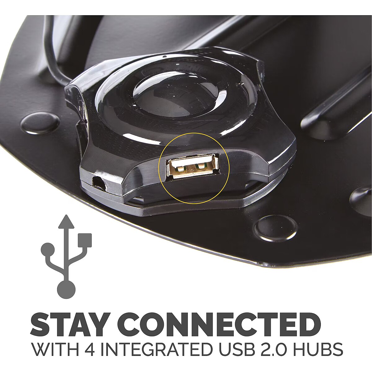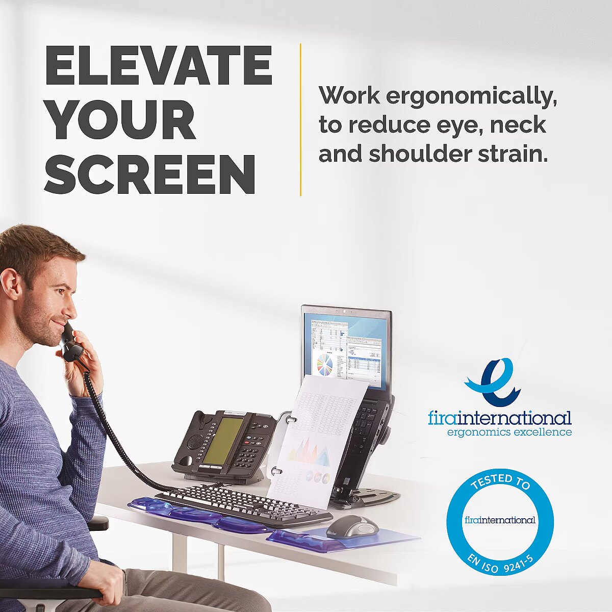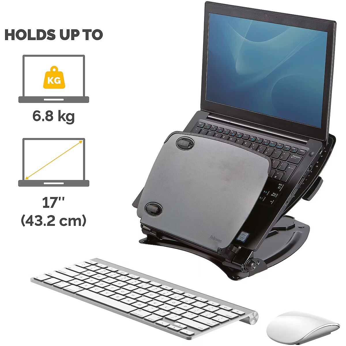 Description - Professional Series™ Laptop Workstation Position your laptop at comfortable height to help prevent neck and back strain 9 easy to adjust height settings to ensure you find the perfect position Features 4 USB 2.0 ports making it easy to stay connected to your favourite devices View documents easily and comfortably with the built-in in-line document holder Sturdy metal frame with rubber feet and surface supports and protects your laptop from slipping Supports laptops up to 17" in size and 6.8kg in weight