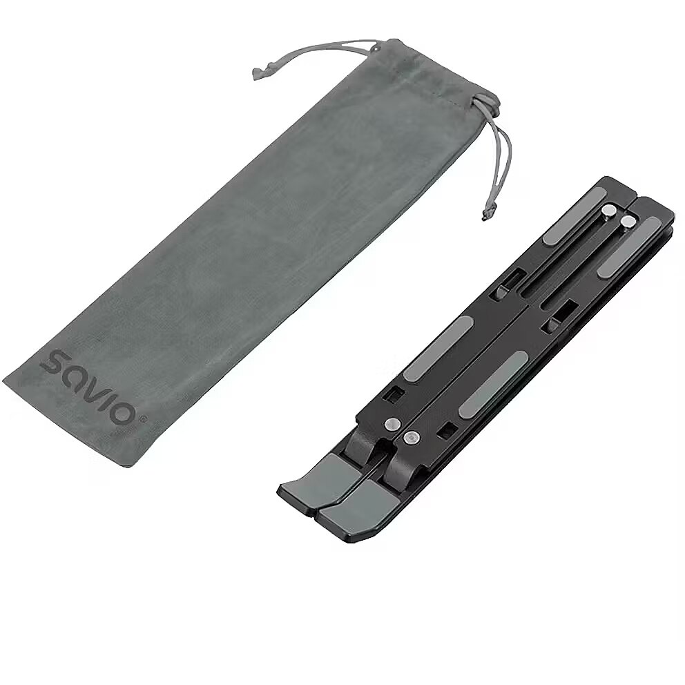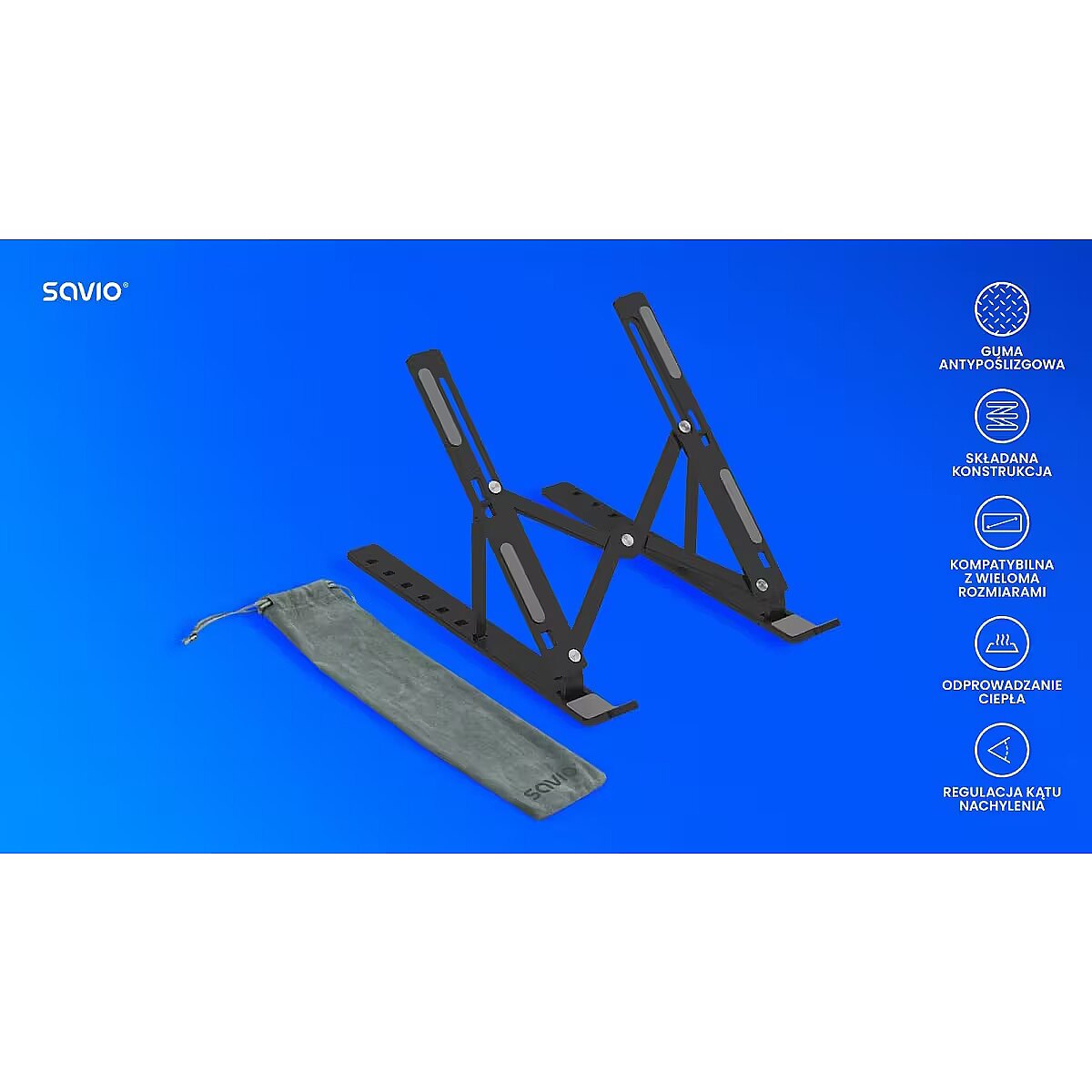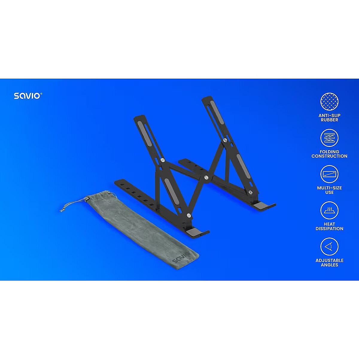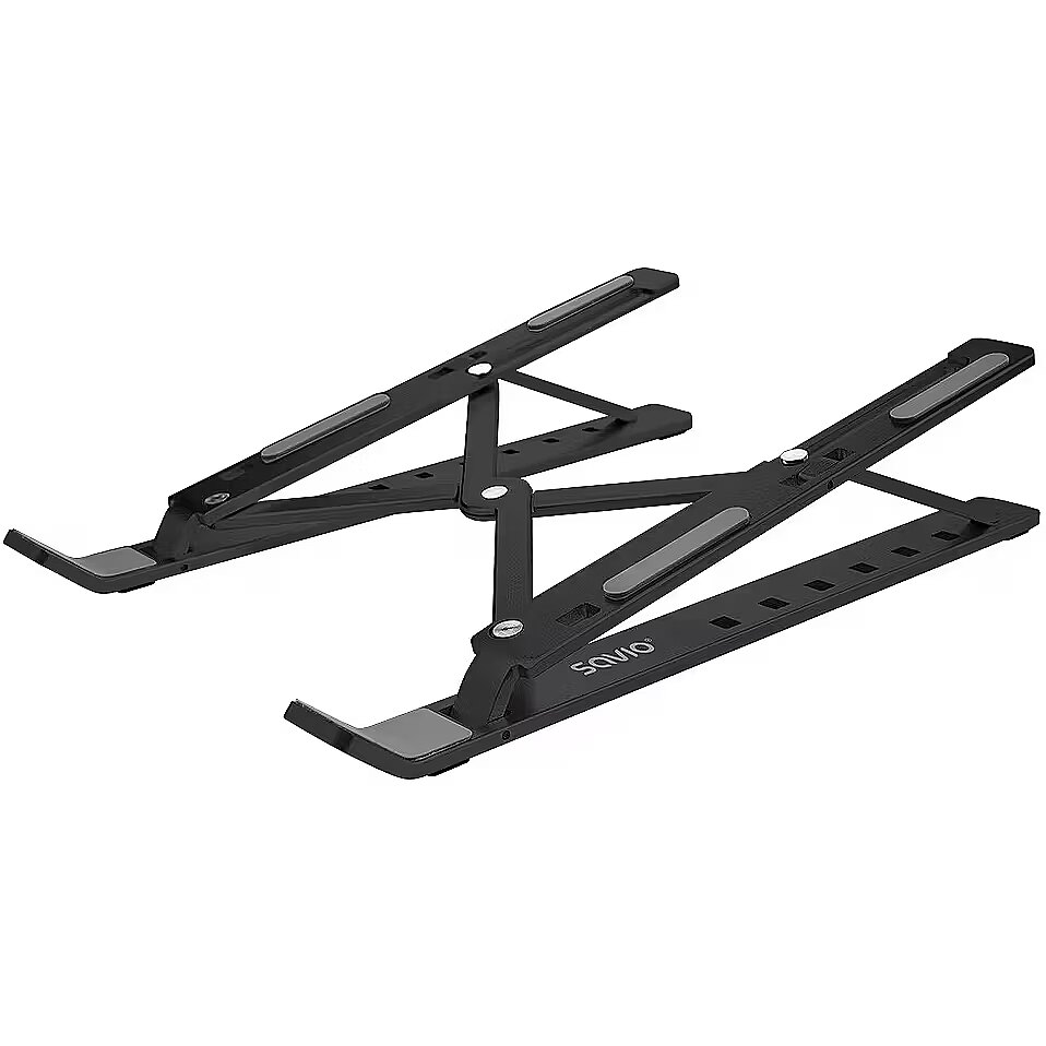 description_en - savio portable stand is a foldable aluminum stand for laptop and tablet use. its design offers a fixed ergonomic viewing angle and improved airflow under the device. silicone pads prevent slipping and protect the device surface.