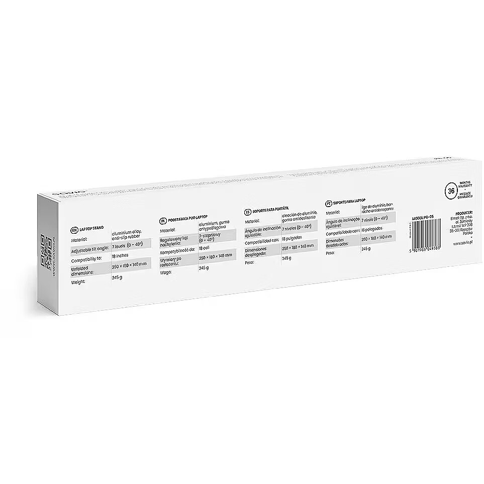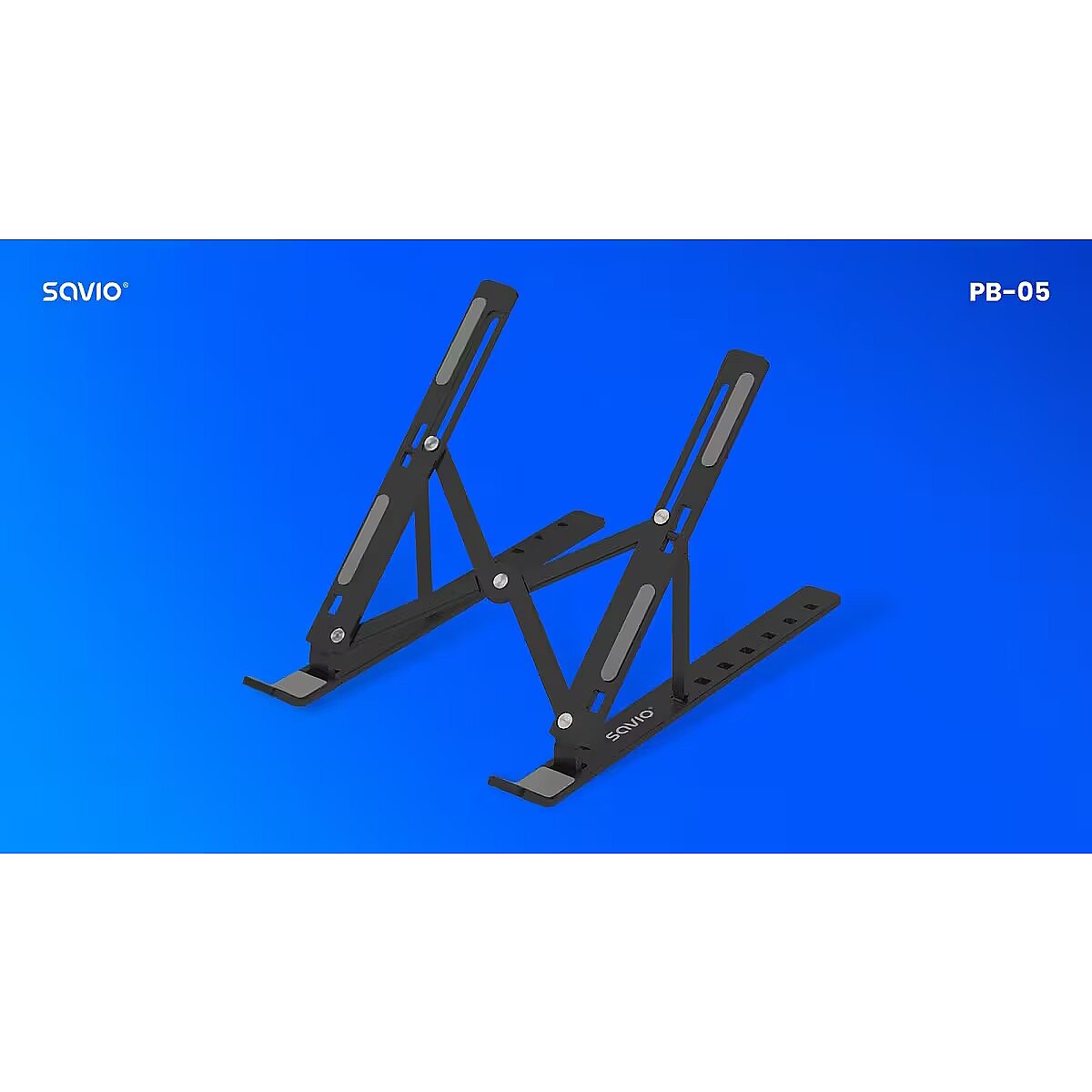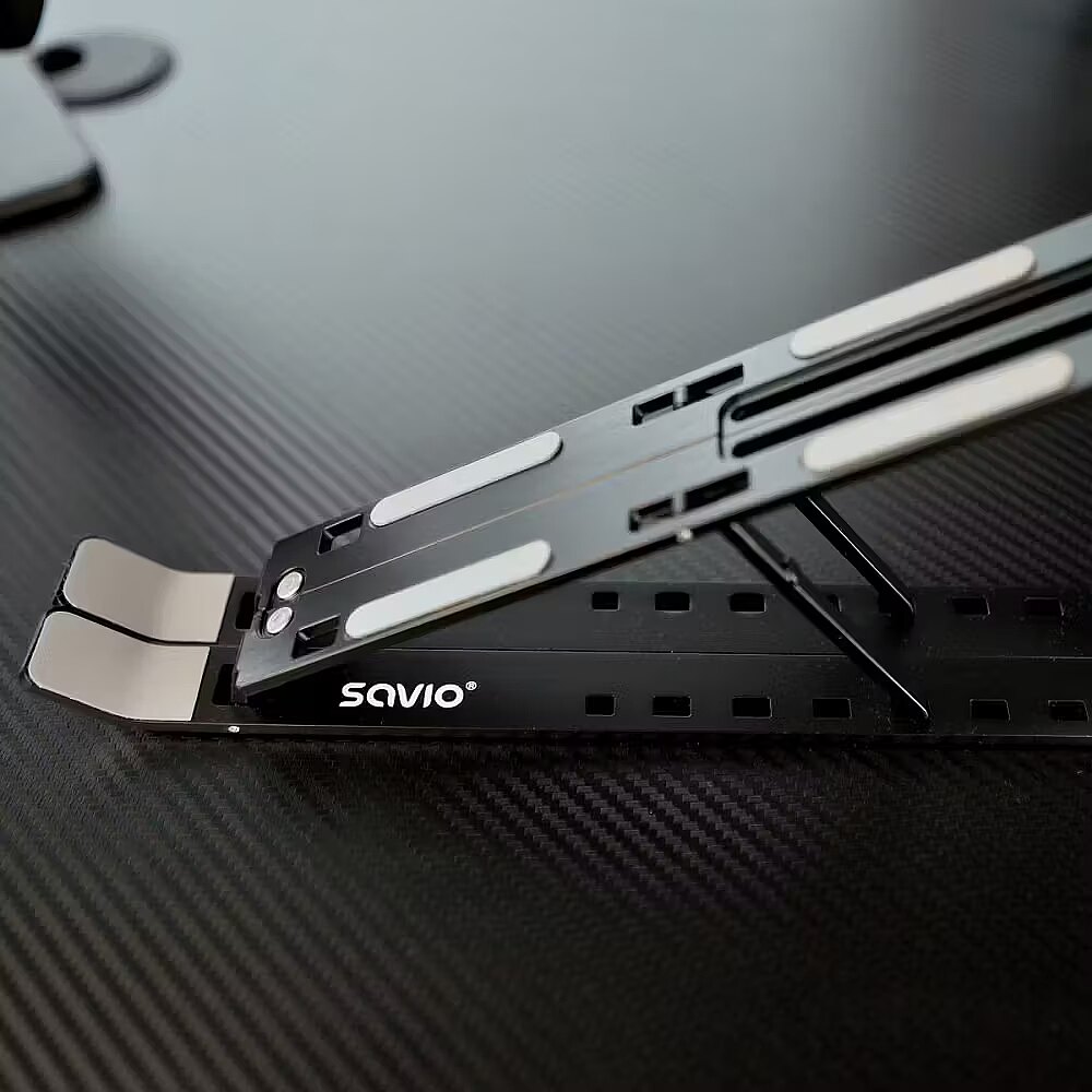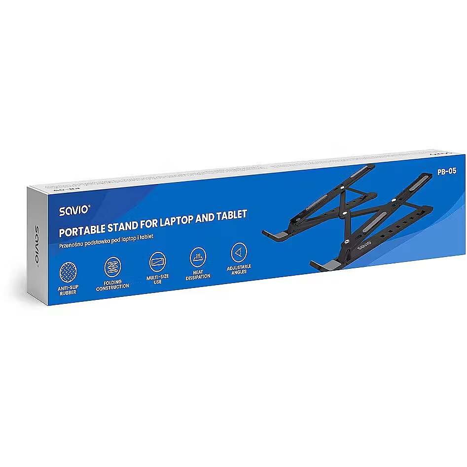 Description - Portable stand for laptop and tablet PB-05 The Savio PB-05 portable laptop and tablet stand was designed with user comfort in mind whether youre at home or on the go. With its 7-step angle adjustment (0°40°), you can easily set the height and angle of your device to match your position. Durable, lightweight, and compact Made from durable aluminum and anti-slip rubber, the PB-05 stand combines strength with portability. Weighing just 245 g, it folds down to fit easily into any bag. Its the perfect choice for those who value mobility without compromising on work comfort. Better ventilation = lower temperature The open design of the stand allows for free airflow, significantly improving your devices ventilation. This helps your laptop or tablet run more stably and protects it from overheating even during intensive use. Universal fit up to 18 inches The Savio PB-05 stand is compatible with devices up to 18 inches in screen size, making it highly versatile. Its stable structure provides reliable support for a wide range of laptops and tablets, regardless of brand.