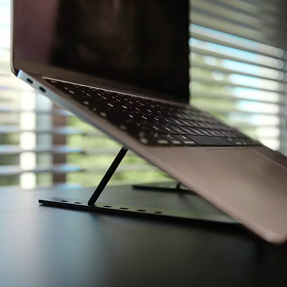 tehniskie parametri: materiāls: alumīnijs + silikona pēdas savietojamība: portatīvie datori un planšetdatori no 10″ līdz 17″ leņķis: fiksēts, aptuveni 15–20° maksimālā slodze: līdz 5 kg salokāms dizains ļauj viegli transportēt krāsa: melna svars: apmēram 300 g izmēri izlocītā veidā: aptuveni 230 × 180 × 20 mm izmēri saloktā veidā: aptuveni 230 × 180 × 18 mm iepakojums: kartona kārba ar uzglabāšanas maisiņu