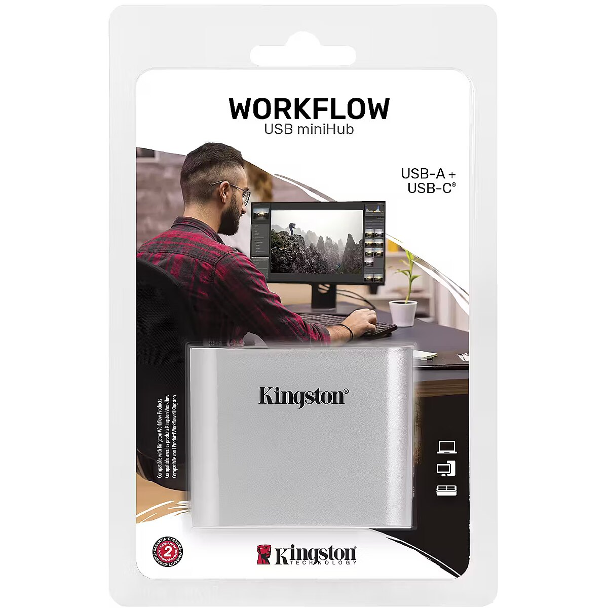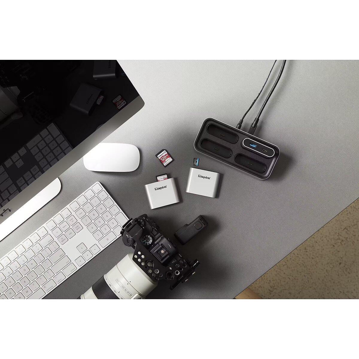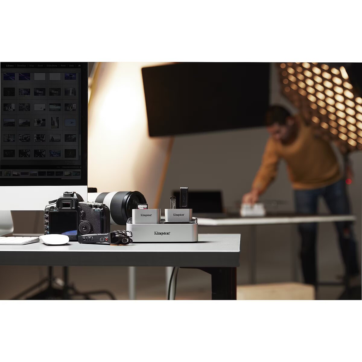 LongDesc - Kingston’s Workflow Station and Readers provide a flexible system to transfer video, photos and audio from multiple sources at once.* Expedite your post-production workflow and create a file offload setup that fits your needs. The Workflow Station Dock is customisable so you can use only the USB miniHub, SD readers or microSD readers that your shoot requires. Whether you’re on a 4K/8K multi-cam shoot with portable audio recorders for each host, or filming B-Roll with drones and GoPros, you can connect up to four readers to the dock simultaneously and transfer footage quickly. The Workflow Station and Readers support USB 3.2 speeds, which get you to your post-production process faster than ever. For added flexibility, the card readers can be used on the go. When you need to shoot on location, simply drop the hub or readers you need into your bag and connect them to your laptop using the included USB cable.Offload files quickerTransfer video, photos and audio from multiple sources at once.*Flexible workflow systemUse only the hub and readers that fit your setup.*Portable versatilityUse the readers on the go via their included USB cable.Incredible performanceWorkflow Station products support USB 3.2 speeds that get you to editing quicker.