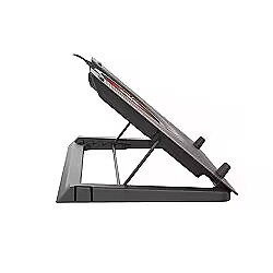 Technical details > Other features - Genesis Oxid 550 is a pad with a large cooling surface made of high-quality aluminum, which additionally enhances heat dissipation. Its construction ensures perfect cooling of both larger laptops up to 17.3” and smaller ones, improving significantly their operation. The cooling system in Genesis Oxid 550 is based on four smaller fans dissipating heat from under the laptop and one large fan providing efficient cooling airflow. With red backlight on each of the fans Genesis Oxid 550 gets a real gaming look. Genesis Oxid 550 provides proper viewing and typing angles with five height adjustment settings for user’s conformity and wrist protection, which can make huge difference during a long gaming fight. The pad is equipped with rubber anti-slip stands to avoid any undesired movement during usage.
