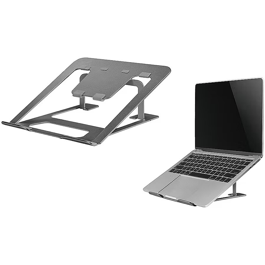 Description - The Neomounts by Newstar NSLS085GREY is a universal stand for laptops from 10" up to 17", with a maximum weight capacity of 5 kg. The stand has six different height positions and a ultra-slim folding design. The lightweight, compact design makes the stand ideal to take with you wherever you want. The open configuration ensures good ventilation of the laptop and the anti-skid silicon pads and safety ledge stopper ensure solid positioning.