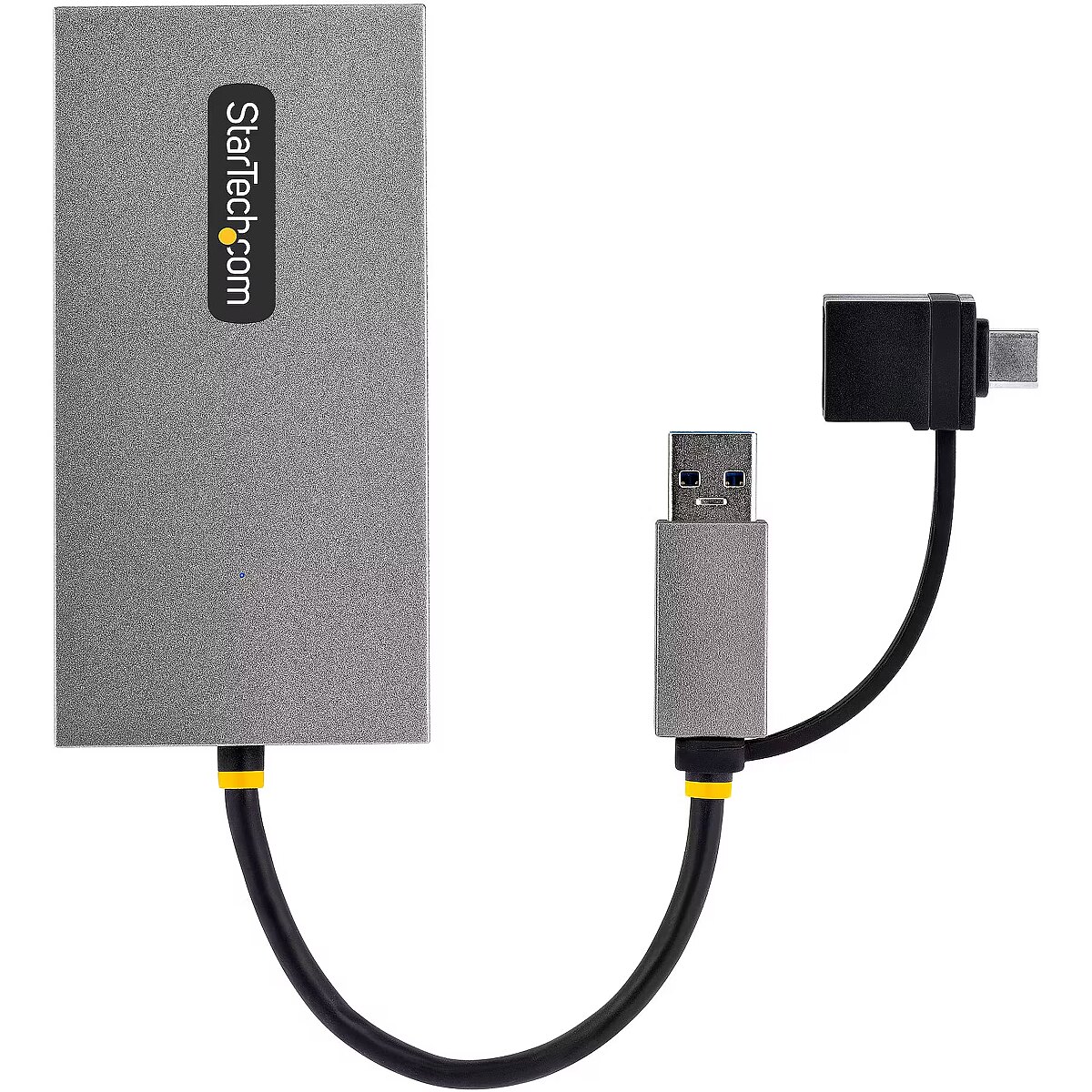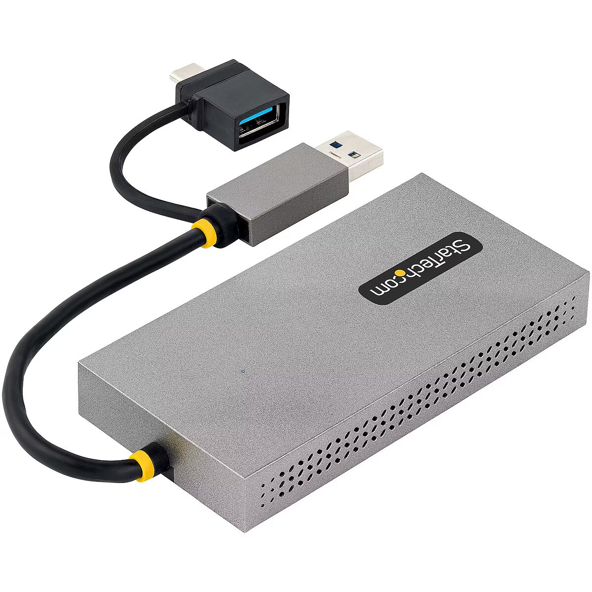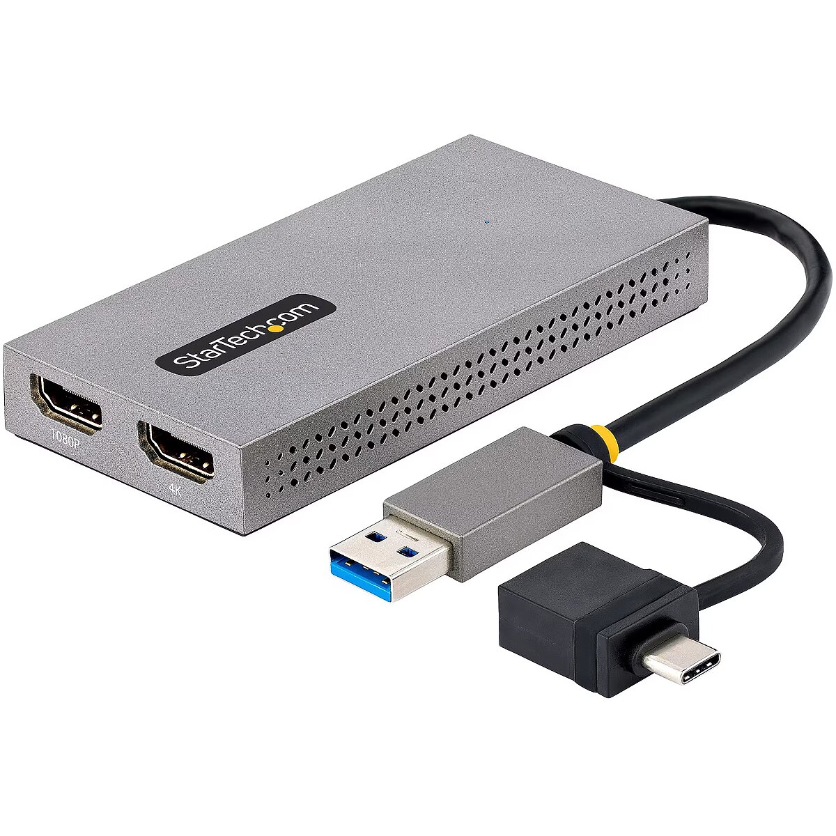 LongDesc - Multi-Monitor USB-A or USB-C Adapter | 1x 4K 30Hz + 1x 1080p | Windows, macOS, & Chrome OSThis USB to Dual HDMI® Adapter enables the addition of two independent HDMI displays (1x 4K & 1x 1080p) to your computer, using a single USB Type-A 3.2 Gen 1 (5 Gbps) connection.Increase Productivity with Multiple DisplaysThis USB to HDMI Dual Monitor Adapter features two video outputs, boosting productivity by connecting up to two displays using a single USB Type-A or C port. The adapter is bus-powered, lightweight, and features an integrated 4.3" (11cm) USB cable, making it ideal for transitioning between the office, home, or connecting to displays in a boardroom.4K ResolutionConnect a 4K 30Hz and a 1080p display to a laptop or desktop. The USB to Multi-Monitor Adapter supports extended or mirrored display modes, and ultrawide displays, providing additional viewing space.Wide-Ranging System CompatibilityThe USB video adapter is compatible with Windows, macOS, and Chrome OS. The integrated USB-A to USB-C dongle ensures USB compatibility with any host running a supported operating system. The attached 4.3in (11cm) cable is convenient for on the go use.107B-USB-HDMI is backed for 3-years by StarTech.com, including free 24/5 multi-lingual technical assistance.The StarTech.com Advantage