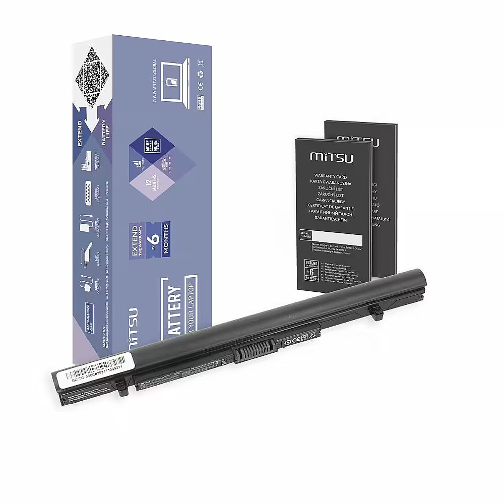 Description - Mitsu Battery for Toshiba A30-C, A40-C 2200 mAh (33 Wh) 14.8 - 14.4 Volt - 5BM726 Model BC/TO-A30C High quality at a reasonable price, safety and ecology are the features of MITSU batteries that have already been appreciated by thousands of Europeans, mainly in Poland, the Czech Republic and Slovakia. It is the result of combining the best components with attention to every stage of the production process, supported by constant quality control, as well as an emphasis on device safety. MITSU is:   High-end, proven, ecological class A lithium-ion cells Actual declared capacity Much slower decline in nominal capacity compared to other cheaper alternatives Low susceptibility to spontaneous discharge No memory effect Factory protections against overcharge and deep discharge, as well as against overvoltage OVP, overheating OTP, SCP short circuit and OCP current overload Reliable and long-lasting time between recharges 6-step quality control.   By buying this laptop battery, you can also be sure that you care for the environment at the same time. The manufacturer closely cooperates with organizations dealing with broadly understood environmental education, supporting selective collection and maximum recovery of waste. MITSU batteries are CE, ROHS and ISO9001 certified products. Replaces batteries: PA5212U, PA5212U-1BRS, PABAS283, Model BC/TO-A30C Fits: Toshiba Portage series A30, A30-C, A30-C-10H, A30-C-113, A30-C-13D, A30-C-13E, A30-C-13H, A30-C-14R, A30-C-14U, A30- C-14X, A30-C-158, A30-C-15K, A30-C-180, A30T, A30T-C, A30T-C-10G, A30T-C1340, R30-C, R30-C PT361A, R30-C PT363A, R30-C PT363C, R30-C PT365A, R30-C PT365C, R30-C-00F, R30-C-00G, R30-C-00H, R30-C-00J, R30-C-00V, R30-C -02J, R30-C-035, R30-C-03M, R30-C-03U, R30-C-05P, R30-C-09X, R30-C-18G, R30-C-1C4, Z20, Tecra series A40, A50, A50-C, A50-C-117, A50-C-16E, A50-C-16F, A50-C-16G, A50-C-16J, A50-C-17E, A50-C-19L, A50-C-1G0, A50-C-1H2, A50-C-1I7, A50-C-1K5, A50-C-1K6, A50-C-1KC, A50-C-1KJ, A50-C-1L7, A50- C-1MT, A50-C-1UF, A50-C-1W2, A50-C-II7, A50-C-N86, C40, C40-C1430, C50, C50-B1500, C50-B1503, C50-C1500, C50- C1502, Z50, Z50-C, Z50-C-10K, Z50-C-10M, Z50-C-10P, Z50-C-10Q, Z50-C-10R, Z50-C-114, Z50-C-11J, Z50-C-11W, Z50-C-125, Z50-C-12N, Z50-C-I25, Satellite Pro series A30, A30-C, A30-C-10R, A30-C-11G, A30-C-14E, A30-C-14F, A40, A40-C, A40-C-13R, A40-C-13U, A40- C-152, A50, A50-C, A50-C-100, A50-C-10E, A50-C-10G, A50-C-11T, A50-C-124, A50-C-125, A50-C- 12P, A50-C-14Z, A50-C-15T, A50-C-15V, A50-C-169, A50-C-16C, A50-C-16D, A50-C-181, A50-C-18X, A50-C-1G9, A50-C-1GL, A50-C-1GW, A50-C-1HF, A50-C-1HG, A50-C-1JH, A50-C-1MT, A50-C-1ND, A50- C-1U1, R40, R40-C, R40-C-103, R40-C-105, R40-C-106, R40-C-10R, R40-C-10U, R40-C-10W, R40-C- 10Z, R40-C-110, R40-C-115, R40-C-11C, R40-C-12H, R40-C-12M, R40-C-12W, R40-C-130, R40-C-132, R40-C-138, R40-C-13V, R40-C-14L, R40-C-150, R40-C-15A, R40-C-164, R40-C-170, R40-C-175, R40- C-17A, R40-C-180, R40-C-190, R40-C-195, R40-C-19E, R50, R50-B, R50-B-107, R50-B-109, R50-B- 10E, R50-B-10G, R50-B-10H, R50-B-10J, R50-B-10K, R50-B-10L, R50-B-10R, R50-B-10V, R50-B-10Z, R50-B-112, R50-B-113, R50-B-114, R50-B-116, R50-B-119, R50-B-11C, R50-B-11E, R50-B-11F, R50- B-11U, R50-B-122, R50-B-123, R50-B-12N, R50-B-12P, R50-B-12Q, R50-B-12R, R50-B -12U, R50-B-12V, R50-B-12W, R50-B-12X, R50-B-12Z, R50-B-132, R50-B-141, R50-B-14F, R50-B-14P , R50-B-14U, R50-B-150, R50-B-154, R50-B-155, R50-B-156, R50-B-159, R50-B-15G, R50-B-15J, R50 -B-15Z, R50-B-161, R50-B-167, R50-B-169, R50-B-16T, R50-B-16V, R50-B-186, R50-C, R50-C-005 , R50-C-100, R50-C-101, R50-C-103, R50-C-104, R50-C-107, R50-C-10F, R50-C-10W, R50-C-10Z, R50 -C-110, R50-C-111, R50-C-114, R50-C-115, R50-C-116, R50-C-119, R50-C-11J, R50-C-11M, R50-C -11W, R50-C-12N, R50-C-12P, R50-C-12Q, R50-C-12R, R50-C-12T