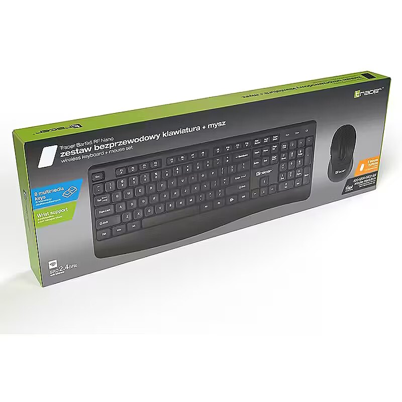 Description - Tracer BARTIX II RF NANO Keyboard + Mouse Set Achieve complete freedom and comfort in gaming with the Tracer BARTIX II RF NANO keyboard + mouse set. This stylish set not only adds elegance to your workstation but also ensures excellent performance and control. 2.4 GHz wireless keyboard Standard size (104 keys) 8 multimedia keys Wrist rest Optical mouse 800 1200 1600 DPI, 5 buttons + scroll wheel Classic black design Wireless Communication Freedom