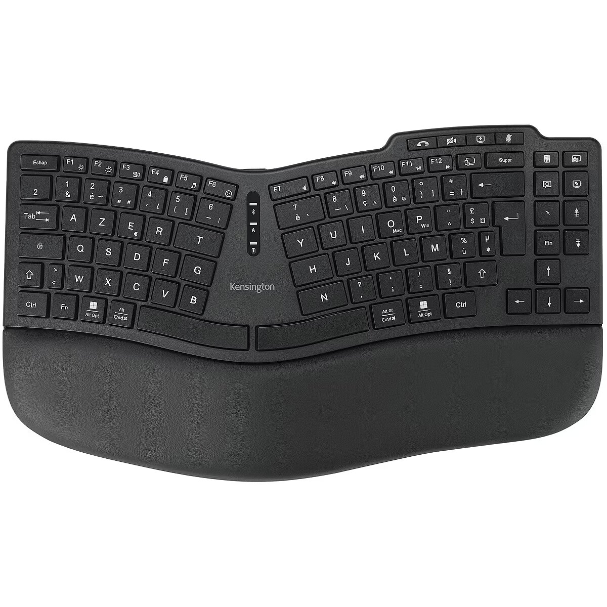 LongDesc - For professionals wanting to reduce the fatigue associated with spending long hours typing each day, the Pro Fit® Ergo KB675 EQ TKL Rechargeable Keyboard supports all-day comfort and productivity with style. The sculpted ergonomic design and curved key layout promotes proper hand and wrist posture, accommodating the natural contour of your hands to provide a more comfortable and productive typing experience. Performance-enhancing features include multiple connectivity options, government-grade encryption security, universal compatibility, and a long-lasting rechargeable battery. Complementing a modern workspace, the Pro Fit® Ergo KB675 EQ TKL Rechargeable Keyboard is an ideal choice for professionals seeking to elevate their typing experience with style, comfort, and performance.Ergonomic DesignThe thoughtfully designed compact curved key layout, built-in wrist pad, and front keyboard legs support optimal hand and wrist positioning for all-day ergonomic comfort and productivity.Multiple Connection OptionsSupports up to three devices—two via Bluetooth® connections and one via the 2.4GHz USB receiver with 128-bit AES government-grade encryption security for a reliable connection up to 10m away. Windows and macOS compatible.Swift Pair TechnologyEnhanced Bluetooth® connection technology designed to reduce pairing hassles and simplify connections for Windows devices.Productivity Enhancing Keys and LightsVideo conferencing keys support efficient meeting transitions. Vibrant RGB indicators allow you to easily monitor your connection status, caps lock, and battery life.Long-Lasting PowerThe built-in 500mAh rechargeable battery includes a convenient USB-C® charging port and cable for uninterrupted productivity.Customizable KeysCustomize your experience by programming keys, creating macros, adjusting key mappings, managing profiles, and more with the optional Kensington Konnect™ software.Sustainability AttributeThe plastic in this product contains 43% post-consumer recycled (PCR) content.