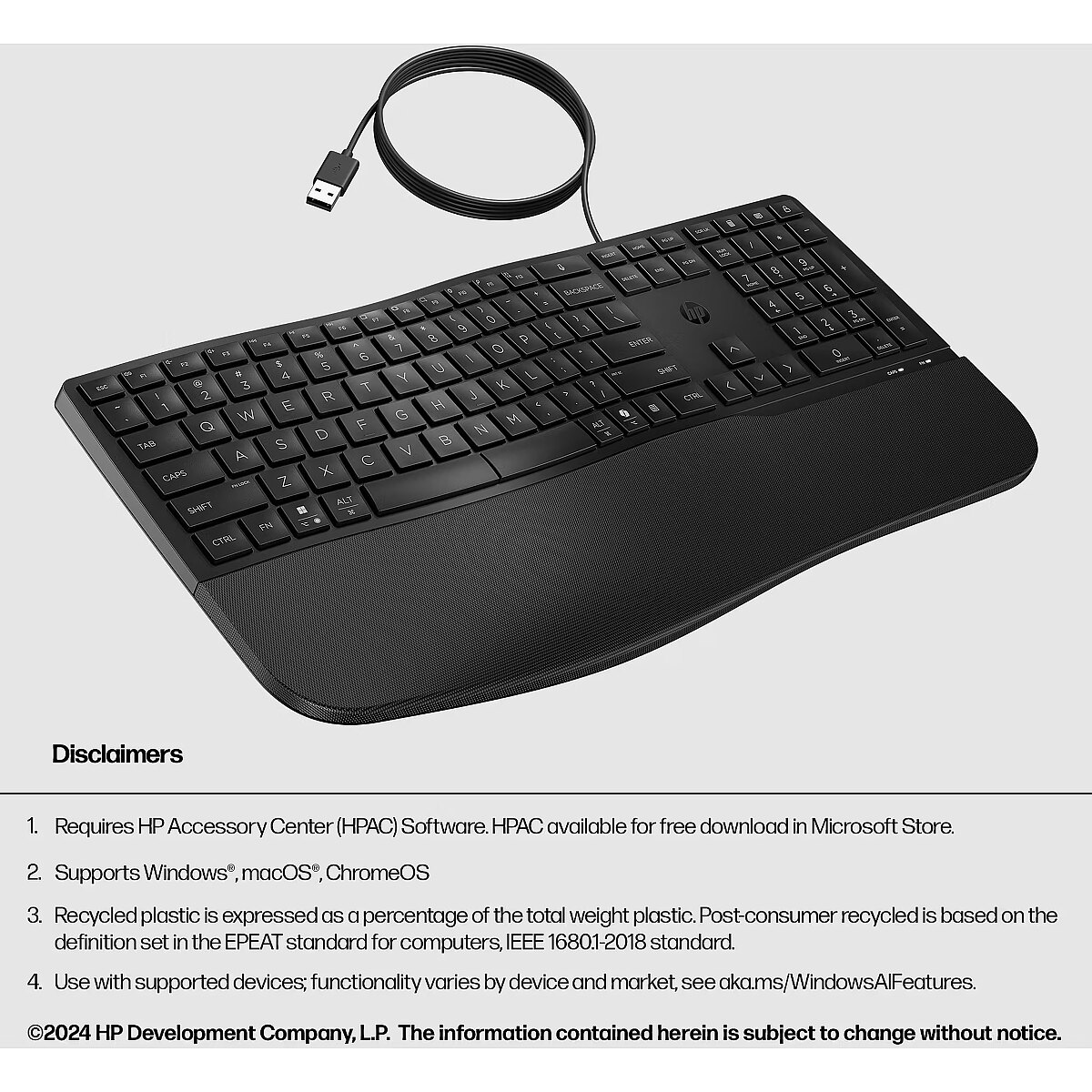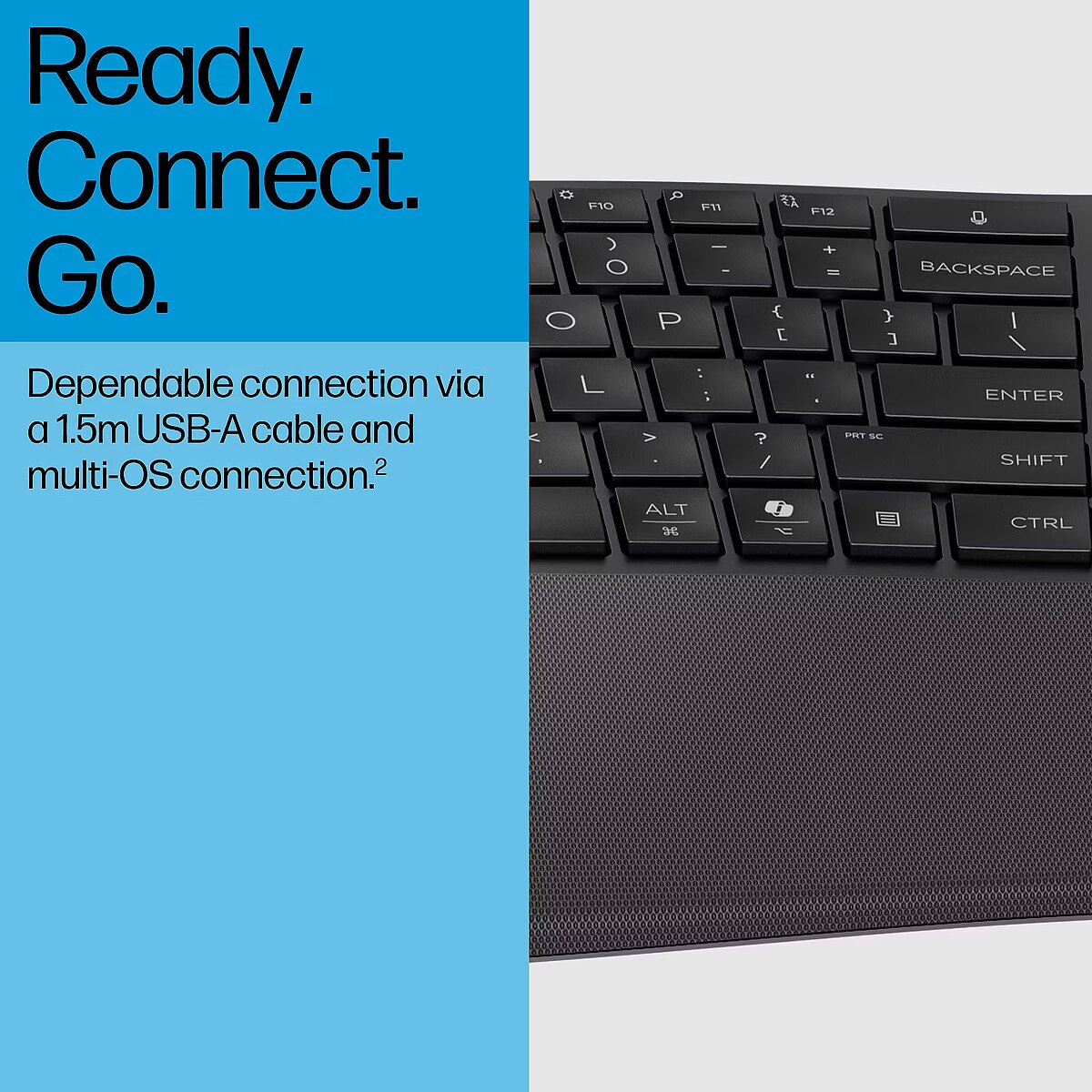 LongDesc - Comfort and technology built around youThe HP 485 Comfort Wired Keyboard is designed to naturally fit your lifestyle as you type throughout the day. Featuring programmable keys[1], adjustable angle, and multi-OS[2] capability, this keyboard was built for you.