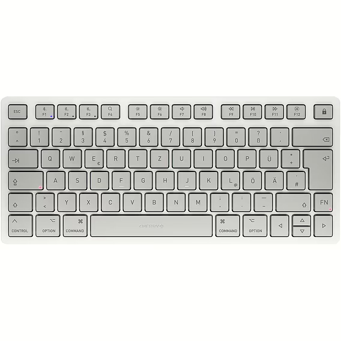LongDesc - Compact multi-device keyboard with Mac layoutThe CHERRY KW 7100 MINI BT FOR MAC is a space-saving Bluetooth® keyboard with Mac layout. The compact dimensions, multi-device functionality and its own carrying case make it an ideal companion for mobile users.The battery-powered keyboard offers the possibility to connect up to three different devices simultaneously via three Bluetooth® 5.1 channels. Once the respective pairing is done, you can easily switch between the connected devices using the F1, F2 and F3 keys. The Mac version is compatible with almost every Bluetooth®-enabled MAC OS, or iOS device.The CHERRY KW 7100 MINI BT FOR MAC is based on the inhouse CHERRY SX scissor mechanism, which guarantees optimum typing quality and precise inputs. The concaveshaped keys enable fatigue-free and low-noise typing. The durable and abrasion-resistant key legends also impress when it comes to sustainability.With its minimalist design, the keyboard takes up little space, making it ideal for limited work spaces, whether at a desk, in college, or on the train. An additional ergonomic advantage of a reduced key layout is that the mouse arm moves closer to the keyboard. This can then lead to an optimized shoulder posture and prevention of tension. The typing angle can also be adjusted by folding the integrated stand-up feet in or outAlthough the CHERRY KW 7100 MINI BT FOR MAC is a compact keyboard, it offers numerous special functions. Among other things, Bluetooth® channels, brightness control, volume control and multimedia functions such as play/pause and track selection can be activated by simple key combinations. The FN key can even be fixed to allow permanent use of the actual F-key functions. Status LEDs are integrated in certain keys to see at a glance which special functions are activated, which BT channel is currently in use and whether caps-lock key is activated.The keyboard comes in a completely plastic-free package that includes 2x AAA lithium batteries as well as a black carrying case made from recycled plastic. This keeps it safe and protected - perfect for mobile working and living.The CHERRY KW 7100 MINI BT FOR MAC impresses with a compact design, multi-device functionality, ergonomic benefits and high-quality typing action. It presents itself as an equal alternative to a full-size keyboard with the same performance and functionality - just without a number pad.