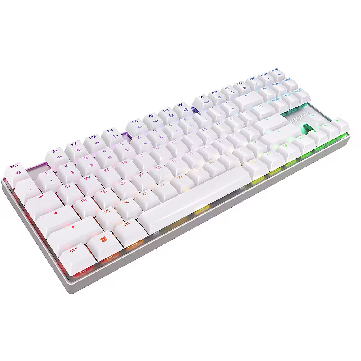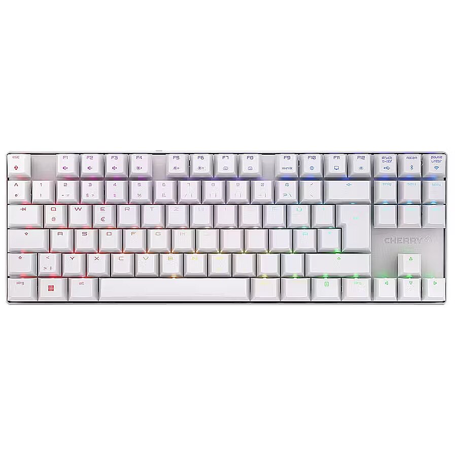 LongSummaryDescription - CHERRY MX 8.2 TKL Wireless RGB. Keyboard form factor: Tenkeyless (80 - 87%). Keyboard style: Straight. Connectivity technology: Wired & Wireless, Device interface: USB + RF Wireless + Bluetooth, Keyboard key switch: Mechanical, Keyboard layout: QWERTZ, Keyboard number of keys: 88. Backlight type: RGB LED. Recommended usage: Gaming. Product colour: White