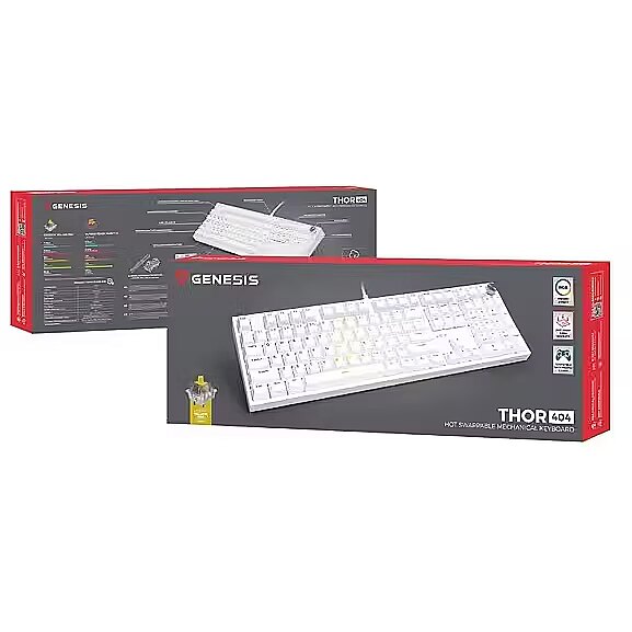 LongSummaryDescription - GENESIS THOR 404. Keyboard form factor: Full-size (100%). Keyboard style: Straight. Connectivity technology: Wired, Device interface: USB, Keyboard key switch: Mechanical, Keyboard layout: QWERTY. Backlight type: RGB LED. Recommended usage: Universal. Product colour: White
