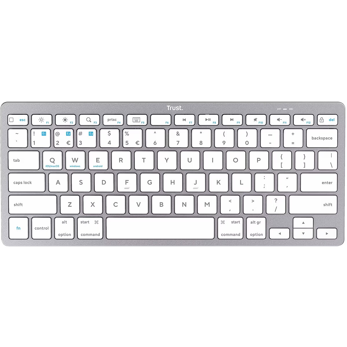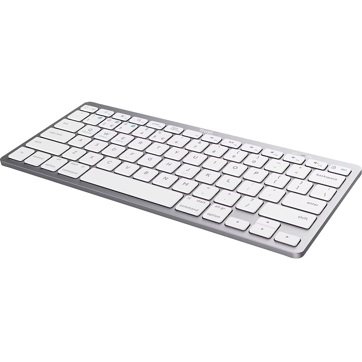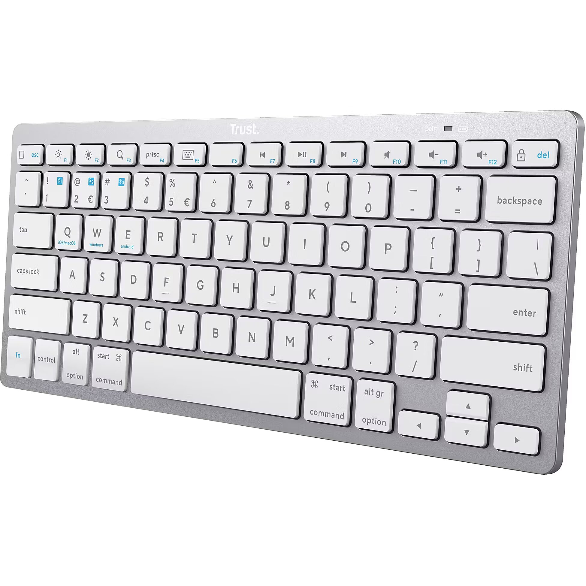 LongSummaryDescription - Trust 24653. Keyboard form factor: Mini, Connectivity technology: Wireless, Device interface: Bluetooth, Keyboard key switch: Scissor key switch, Keyboard layout: QWERTZ, Keyboard number of keys: 85, Recommended usage: Office. Product colour: Silver, White