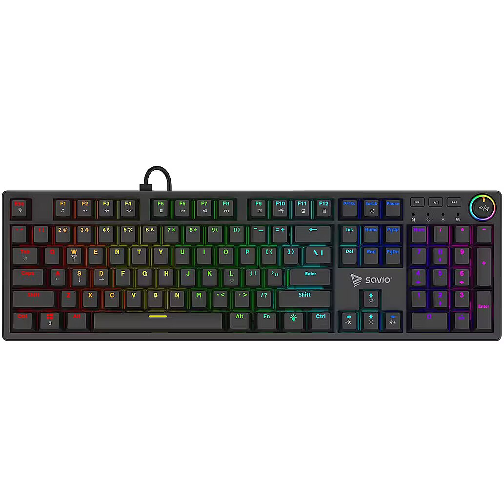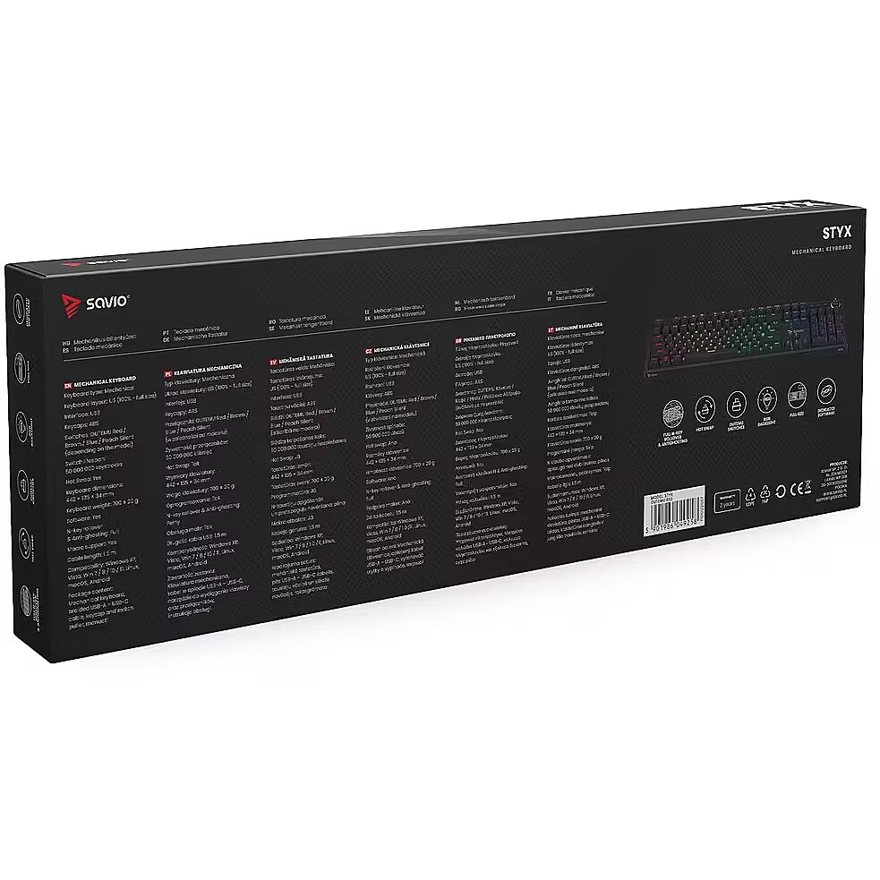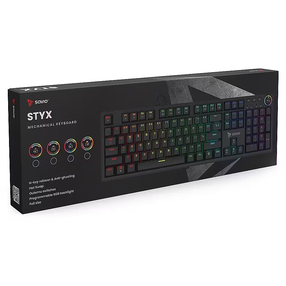 Description - Mechanical keyboard STYX OUTEMU Savio STYX is a full-size mechanical keyboard created for gamers and professionals who dont accept compromises. It combines everyday comfort with gaming-grade performance and striking design. With rich personalization, high durability, and modern features, STYX excels both in gameplay and at work. Full N-Key Rollover & Anti-ghosting The Savio STYX features N-key rollover  the ability to register many key presses simultaneously. In addition, Anti-ghosting (eliminating false signals from keys that werent actually pressed) ensures maximum precision. Even the most dynamic key combinations in games or office work are captured flawlessly. Hot-swap Function STYX offers Hot-swap (the ability to replace switches yourself without soldering). In just moments you can swap to different switches to tailor the keyboards feel to your needs no specialized tools required. Its a perfect solution for anyone who wants to experiment with various switch types or easily replace worn parts. OUTEMU BROWN Switches tactile precision and comfort In the version with OUTEMU BROWN switches (i.e., tactile mechanical switches with a noticeable actuation bump, moderate operating force, and quiet operation), STYX offers an excellent balance between control and speedideal for both gaming and long typing sessions. The gentle tactile bump helps you feel the exact actuation point, which translates into fewer errors and greater comfort. The switches are rated for up to 50 million keystrokes. 21 RGB Lighting Modes The keyboard offers full RGB (Red, Green, Blue) backlighting with 21 modes to choose from. From static effects to dynamic animations you can easily match the lighting style to your mood, game, or desk aesthetic. Full-size Layout STYX is a full-size keyboard with a complete key layout, including a numeric keypad and dedicated multimedia keys. This gives you maximum functionality whether youre gaming, working, or editing media. An additional advantage is the multifunctional knob, which lets you adjust volume and lighting without using key shortcuts. Specification Keyboard type: Mechanical Keyboard layout: US (100% - full size) Interface: USB Keycaps: ABS Switches: OUTEMU Red / Brown / Blue / Peach Silent (depending on the model) Switch lifespan: 50 000 000 keystrokes Hot Swap: Yes Keyboard dimensions: 442 x 135 x 34 mm Keyboard weight: 766g Software: Yes Length: 1.5 m Compatibility: Windows XP, Vista, Win 7 / 8 / 10 / 11, Linux, macOS, Android Package content: Mechanical keyboard, braided USB-A USB-C cable, keycap and switch puller, manual