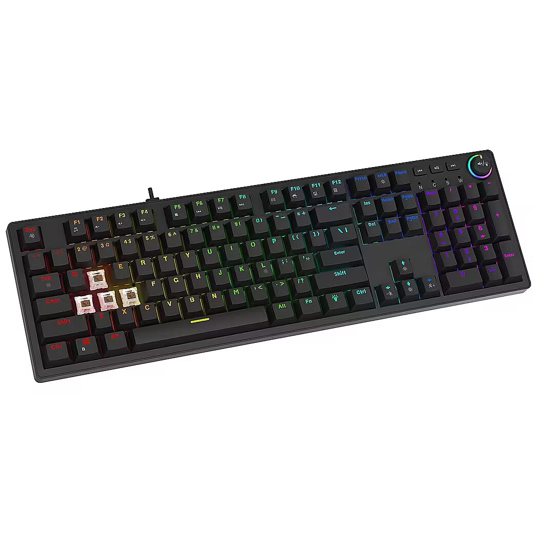 Specifications: Type: Mechanical keyboard Model: STYX BROWN Color: Black Form factor: 100% (104 keys) Switches: Outemu Brown (tactile, non-clicky) Lighting: RGB LED, 21 modes Hot Swap: Yes Case material: ABS plastic Keycaps material: Double-shot ABS Cable length: 1.5 m Connection: Wired (USB-A/USB-C) Compatibility: Windows, macOS, Linux
