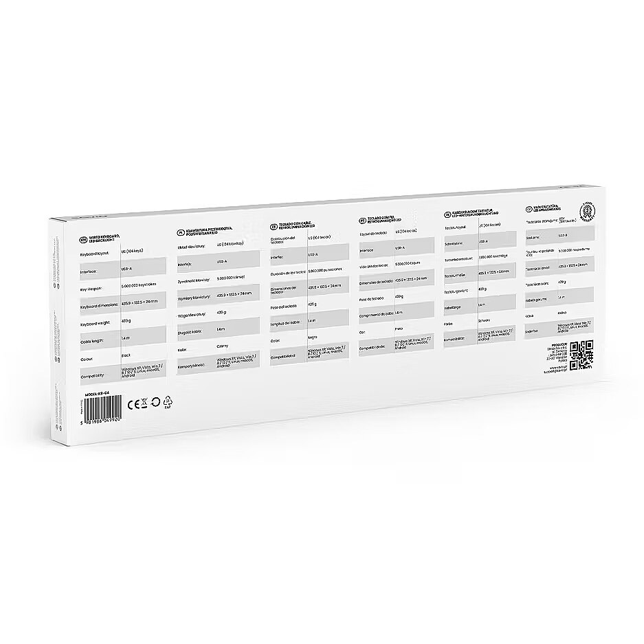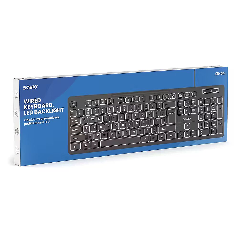 Description - Wired keyboard LED backlighting KB-04 The KB-04 wired LED backlit keyboard is the perfect choice for both work and entertainment slim, comfortable, and ready to use immediately after plugging in. The full-size US layout (American key layout, 104 keys) ensures intuitive typing, while the USB-A cable (Universal Serial Bus Type A connector) provides a stable, lag-free connection. Low Profile Low-profile keys require less actuation force and have a shorter travel distance, resulting in faster, quieter, and more comfortable typing even during long sessions. A lifespan of up to 5,000,000 keystrokes ensures years of reliable performance. Slim Design The minimalist casing features a slim and lightweight design, making it easy to fit under a monitor or on a sliding shelf. The 1.4 m cable allows for convenient cable management and keeps your workspace tidy. The black color matches any computer setup universally. LED Backlit Keys Even LED backlighting (light-emitting diode) makes it easier to work in the evening and in low-light conditions. The keys remain clearly visible, reducing typing errors and speeding up everyday tasks. Plug & Play (ready to use) Simply plug in the USB-A connector and start typing no additional drivers required. Full compatibility with Windows XP/Vista/7/8/10/11, Linux, macOS, and Android ensures smooth operation across various devices and systems. Specifications Keyboard layout: US (104 keys) Interface: USB-A Key lifespan: 5,000,000 keystrokes Keyboard dimensions: 435.9 × 132.5 × 24 mm Keyboard weight: 439 g Cable length: 1.4 m Color: Black Compatibility: Windows XP/Vista/7/8/10/11, Linux, macOS, Android