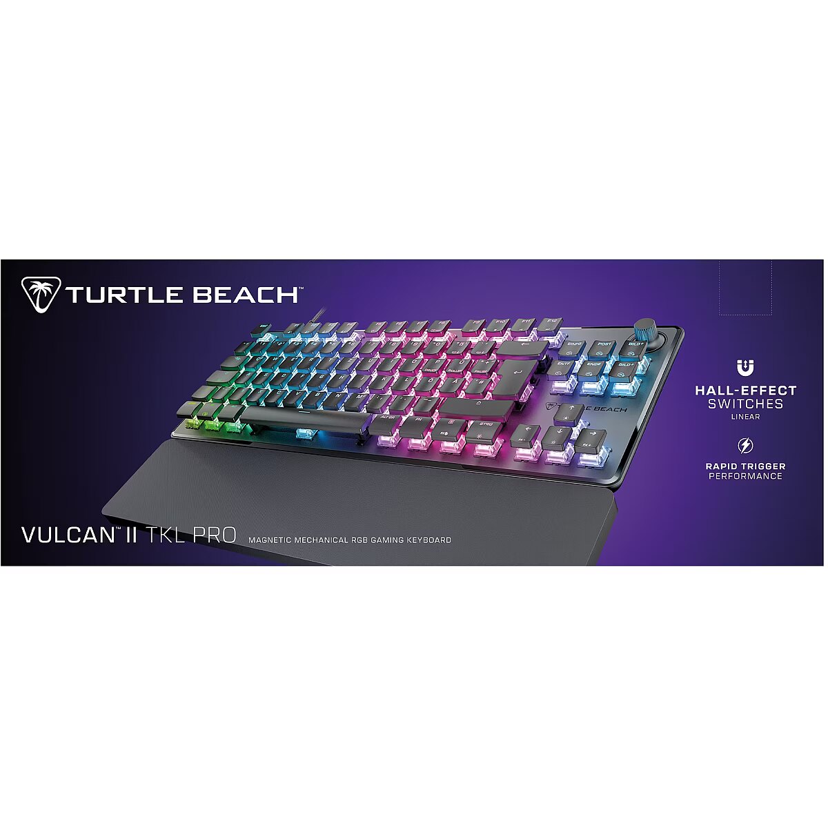 LongDesc - Insanely responsive, and immensely customizable, the Turtle Beach Vulcan II TKL Pro Magnetic Mechanical RGB PC gaming keyboard delivers pro-level performance in a compact TKL form. Equipped with analog hall-effect magnetic switches for silky smooth, reliable key presses rated at a 150M click lifecycle and they have a fully adjustable actuation point from 0.1mm to 4mm. And with Rapid Trigger setting, you’ll have better, more precise movement control, with less downtime between key presses. Lastly, the per-key AIMO™ Intelligent RGB lighting, five on-board profiles and adjustable actuation points can all be customized using the Swarm™ II desktop software. Analog Hall-Effect Magnetic SwitchesUltra-responsive magnetic switches are pre-lubed and rated at a 150M click lifecycle for silky smooth, long-lasting key presses. Hall-effect technology equips you with game-changing features like Rapid Trigger setting, controller emulator, adjustable multi-point actuation, and more.Rapid Trigger PerformanceDominate your opponents in FPS and battle royale games with Rapid Trigger setting. Rapid Trigger eliminates downtime between key presses, so you can immediately repress, resulting in better movement control, responsiveness and faster aiming.Per Key Sensitivity AdjustmentAdjust the actuation point of every key together or individually, with shorter key travel for faster response in shooters, or longer key travel for more deliberate, precise control. Each key has 40 presets heights from 0.1mm to 4mm and you can assign up to three inputs per key. Plus, for added convenience these can be adjusted all together using the keyboard or individually in the Swarm™ II desktop software.AIMO™ Intelligent RGB Lighting With double the refresh rate of a standard gaming keyboard, AIMO™ lighting technology produces smooth and vibrant RGB lighting effects right out of the box and can sync with other compatible AIMO™-enabled products.Advanced Customization with Swarm™ II SoftwareTake your keyboard performance and aesthetics to the next level using the Swarm™ II desktop software. Adjust the AIMO™ RGB lighting, assign up to three different inputs per key, adjust key actuation points, enable Rapid Trigger setting and record & assign macro functions. And for even further customization, you can assign controller emulator features such as left analog stick control for precise, smooth 360-degree movements, in FPS, open world and adventure games, and assign left and right trigger control for gradual acceleration or braking in racing games.5 On-Board ProfilesSave up to five on-board profiles for custom lighting, key re-assignments, macros, basic functions, Hotkeys and more.Easy-Shift [+] ™ Button DuplicatorOur Easy-Shift [+] ™ technology adds a secondary function to compatible keys. Simply hold down the designated modifier key for double the command power in an instant, plus it’s fully customizable in Swarm™ II.Advanced Anti-GhostingAdvanced Anti-Ghosting technology is optimized for gamers to ensure reliable keystrokes every time, even when multiple keys are pressed at once.3rd Party Keycap CompatibleThe Vulcan II TKL Pro is equipped with T-shaped ABS keycaps and is fully compatible with 3rd party keycaps to customize your layout.Tenkeyless Form Factor The tenkeyless form factor lets you play in a more natural, comfortable position while allowing for a larger pad and more area for mouse movement, improving your aiming accuracy.Push-to-Mute Volume WheelControl master volume on the fly, and quickly push to mute using the built-in dial.Sleek, Award-Winning DesignAn iconic design featuring an aluminum plate reinforces its structural integrity and protects against wear and tear. Plus, a double kick stand design with an included, soft palm rest ensures comfort over long usage.