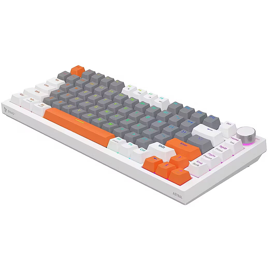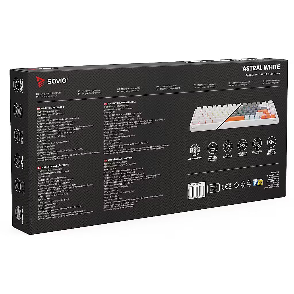 Description - Gasket magnetic keyboard ASTRAL OUTEMU White Jade, 3-color keycaps white Meet ASTRAL the keyboard that changes the rules of the game. This isnt just another classic mechanical keyboard. Its an advanced weapon in your arsenal, built on revolutionary magnetic technology. Encased in a compact 82-key layout, it saves valuable desk space for wider mouse movements without sacrificing functionality. Built with a Gasket Mount structure, the keyboard provides an incredible typing and gaming experience. Thanks to the metal plate with silicone gaskets and layers of damping and sound-absorbing foam, every keystroke feels soft while unwanted echoes and noise are completely eliminated. Full N-key Rollover and Anti-ghosting In the heat of battle, every millisecond and every command matters. ASTRAL White comes equipped with full N-key rollover. What does that mean? You can press all keys at the same time, and the system will flawlessly register each one. This feature is complemented by Anti-ghosting technology. Forget about annoying ghosts those moments when the keyboard registers a key you didnt press or fails during complex combos. Here, you can be sure that your combo executes exactly as intended. Outemu White Jade Magnetic Switches At the heart of ASTRAL are the advanced Outemu White Jade magnetic switches, which use a Hall-effect sensor to detect the position of a magnet instead of a traditional physical contact. As a result, actuation is completely contactless, significantly increasing the keyboards durability and precision. What does this mean for you? Reduced mechanical resistance and faster response compared to traditional mechanical switches Exceptional smoothness: the movement is perfectly linear and fluid Legendary durability: lifespan rated at 100,000,000 clicks a long-term investment for years of intensive gaming Programmable RGB Backlighting The keyboard features fully programmable RGB lighting, capable of displaying over 16 million colors. With dedicated software, you can create your own macros (command sequences) and customize lighting effects to match your mood or the game youre playing. PBT Keycaps Forget about slippery, shiny keycaps that collect fingerprints. ASTRAL is equipped with PBT keycaps (polybutylene terephthalate) a material much harder and more durable than standard ABS. PBT keycaps offer: A matte, slightly textured surface for a stable grip even during intense gameplay Exceptional wear resistance the legends remain crisp and readable for years Multimedia Control Knob Full control without leaving your game. The built-in, elegant multimedia knob lets you instantly adjust or mute the volume with a single motion. No more shortcuts or minimizing your game just to hear your opponents footsteps or lower the music. Its convenience youll appreciate every day.