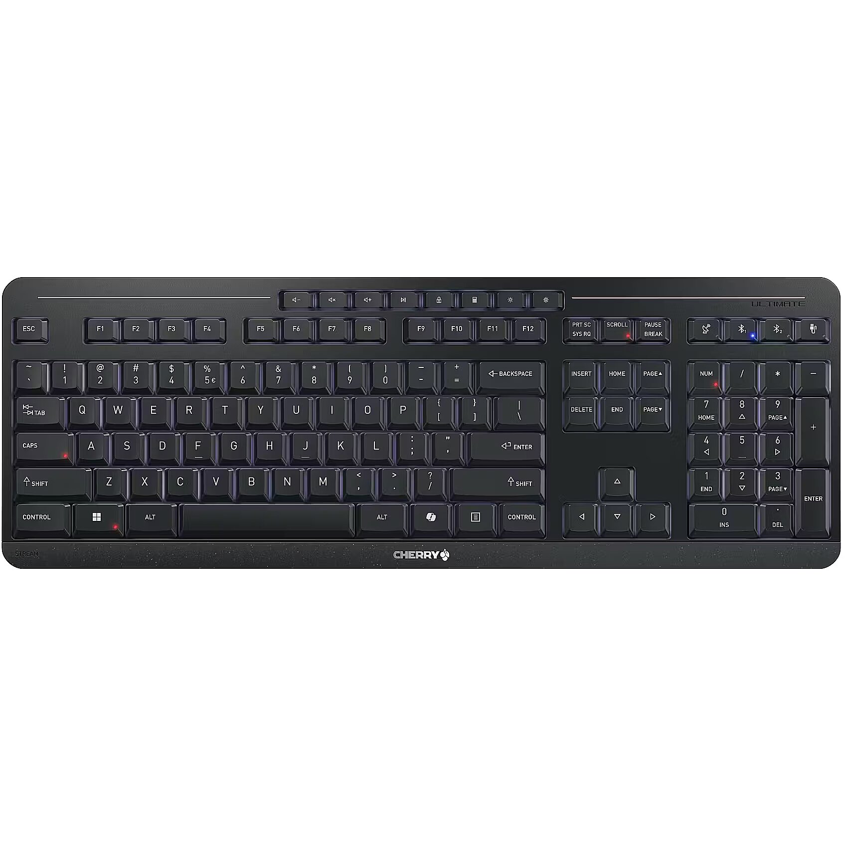 LongSummaryDescription - CHERRY Stream keyboard ultimate. Keyboard form factor: Full-size (100%). Keyboard style: Straight. Connectivity technology: Wired & Wireless, Device interface: USB + RF Wireless + Bluetooth, Keyboard key switch: Scissor key switch, Keyboard layout: QWERTY. Backlight type: LED. Recommended usage: Home/Office. Product colour: Black