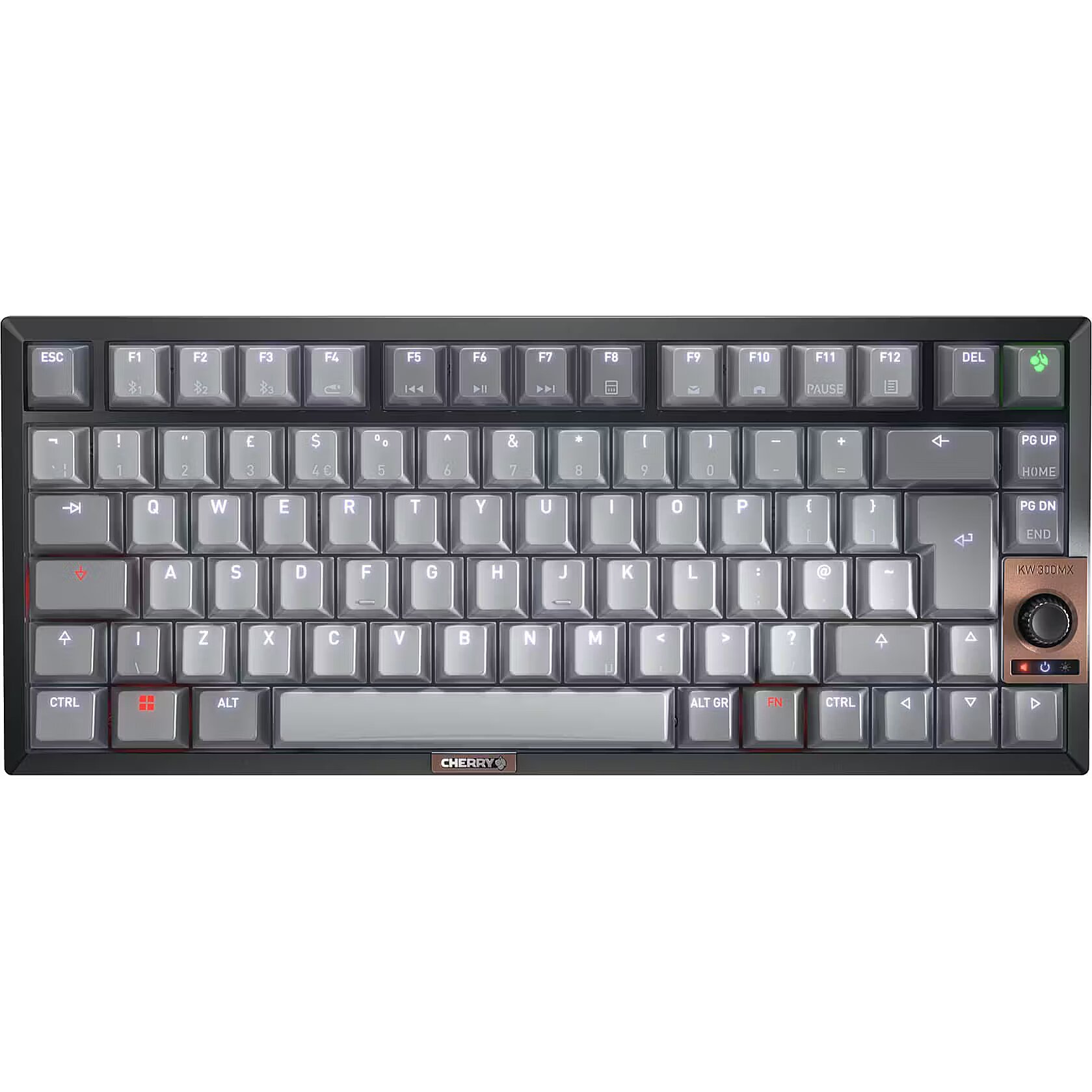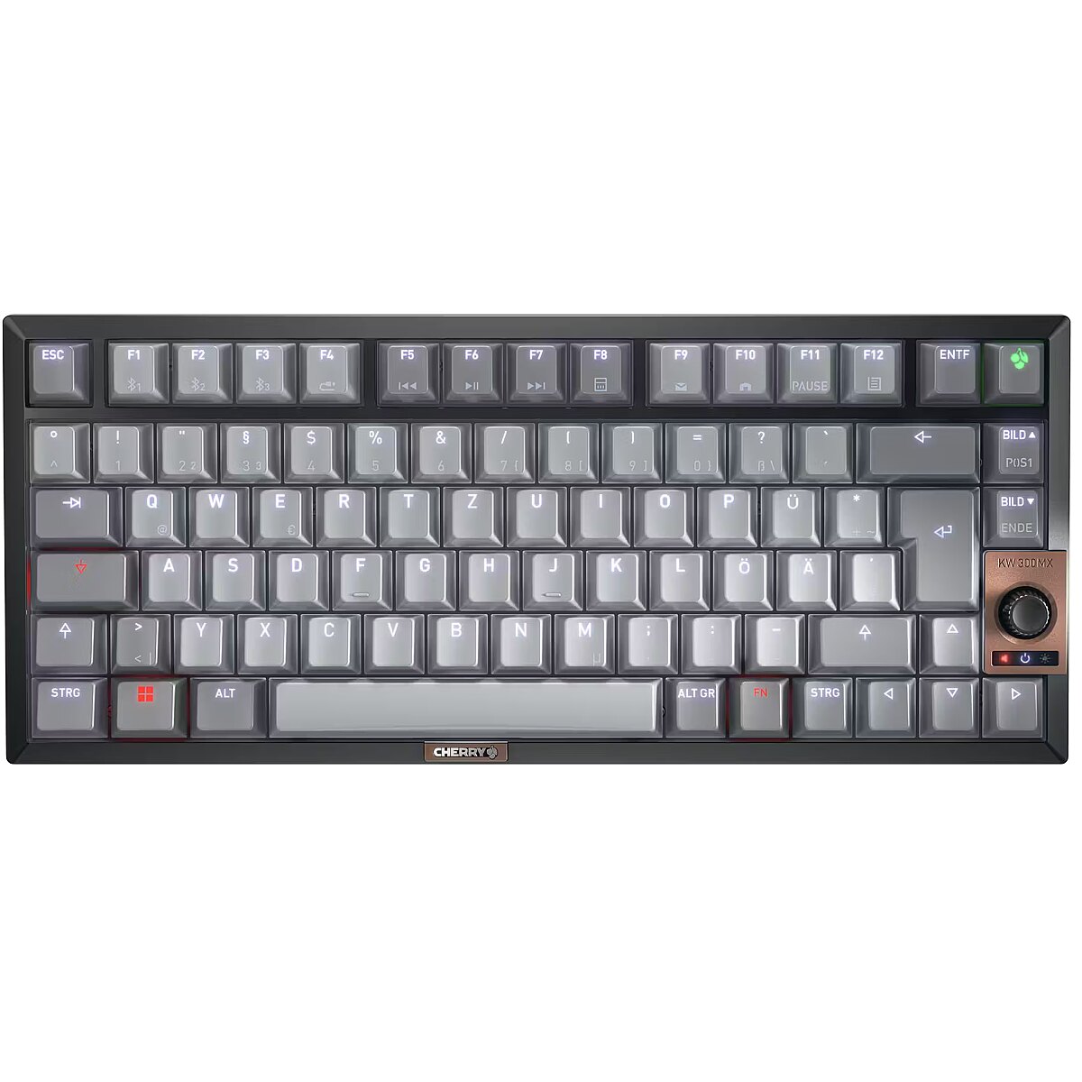 LongSummaryDescription - CHERRY KW 300 MX. Keyboard form factor: 75%. Keyboard style: Straight. Connectivity technology: Wired & Wireless, Device interface: USB + Bluetooth, Keyboard key switch: Mechanical, Keyboard layout: QWERTZ. Backlight type: LED. Cable length: 1.8 m. Recommended usage: Home. Product colour: Black, Copper, Grey