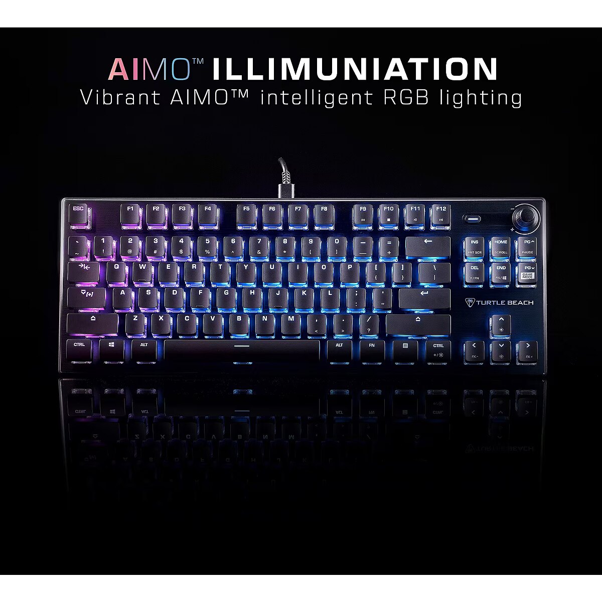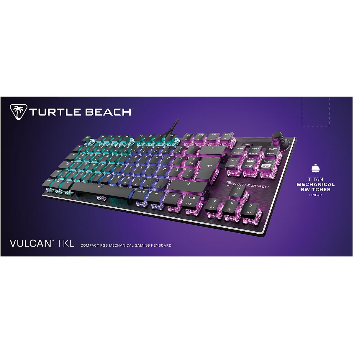 LongDesc - The Turtle Beach® Vulcan TKL is a tenkeyless variant of the award-winning Vulcan keyboard family. This smaller form factor means gamers have room for a larger pad and can use a bigger range of mouse movements, ultimately giving them greater accuracy. The linear TITAN Switch Mechanical delivers the industry’s best in speed and responsiveness. The switch adds to a comprehensive feature set that gamers know and love. The low-profile design is engineered for comfort and to reduce fatigue. Impressive durability and build quality thanks to its reinforcing black anodized aluminum top plate, switches rated to 50 million keystrokes, dedicated mixer-style audio controls and per-key AIMO™ RGB lighting.FEEL THE LIGHTThe Turtle Beach® Vulcan TKL keyboard features the linear TITAN Switch Mechanical for speed and responsiveness. It also boasts mixer-style controls, an aluminum top plate and AIMO™ RGB lighting.THE BEST MADE BETTER The award-winning Vulcan is re-imagined in a tenkeyless form factor. All the features you expect in a smaller design.TITAN MECHANICAL SWITCHES (LINEAR)Designed and built entirely by our engineers and developed for gamers who love the feel of mechanical switches but demand a smooth and rapid actuation.LONG-LASTING DURABILITYThe keyboard is reinforced by an aircraft-grade aluminum layer to make it extra strong and durable. Titan switches are designed to keep dust and dirt out, helping to keep it in top condition.TENKEYLESS FORM FACTOR This smaller factor allows for a larger pad and a bigger range of mouse movements, improving your aiming accuracy.AIMO™ ILLUMINATIONAIMO produces vibrant lighting displays in 16.8 million colors right out of the box. It also syncs with other compatible AIMO products for illumination scenarios that flow across devices.