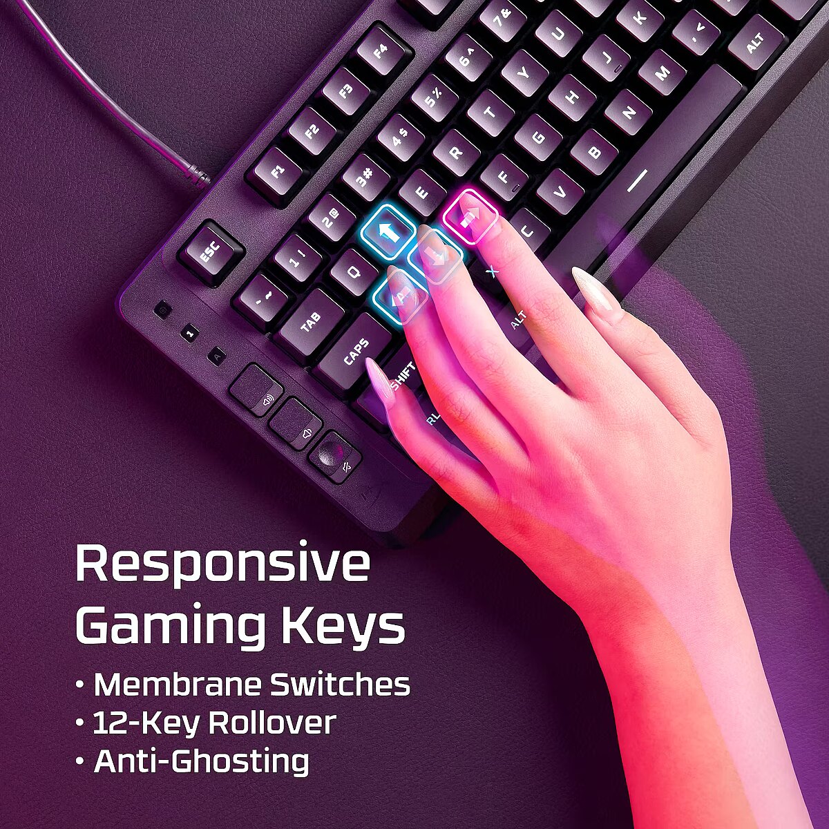 The HyperX Eve 1800 Gaming Keyboard is a compact gaming keyboard that gets you started right. With its condensed layout, you get more desk space for your mouse, microphone, and headset. Enjoy 10 zones of customizable, dynamic RGB lighting and turn your keyboard into the perfect accessory for your PC. Beyond lighting effects, this budget-friendly keyboard delivers style and performance in a sleek design with convenient media buttons. It features anti-ghosting and 12-key rollover, so your keypresses register exactly when they need to. Plus, the membrane switches deliver satisfying, cushioned keypresses that won't disturb you while you play. After all, this is the eve of your gaming adventure.
