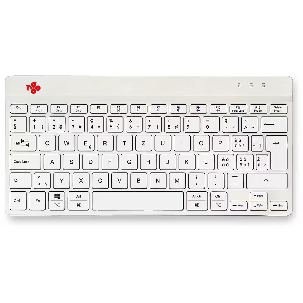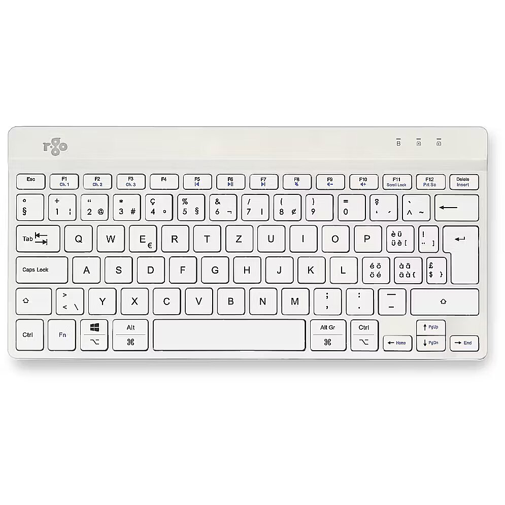 ShortSummaryDescription - R-Go Tools Ergonomic keyboard R-Go Compact Break, compact keyboard with break software, QWERTZ (CH), Bluetooth, white, Mini, Wireless, Bluetooth, Scissor key switch, QWERTZ, White