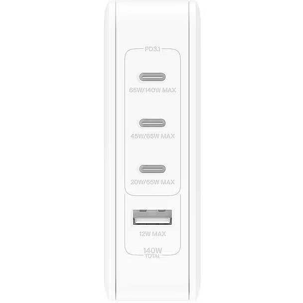 Description - Quickly charge 4 devices at once. Our 4-port charger gives you a maximum of 140W power to efficiently charge a laptop and up to three additional devices at the same time. Compact and travel ready. Inter-changeable tips are included for US, UK, and EU plug types. The compact design features foldable prongs (US only) to make travel even easier. Fast, safe GaN charging for all. Features integrated GaN technology for safe and efficient high-wattage charging. Supports fast charging of all compatible PD3.1- and PD3.0-enabled devices. Fast, safe simultaneous charging. Charge a MacBook Pro at full speed or fast charge an iPhone and iPad while charging two additional devices at the same time with our 140W 4-Port GaN Charger. This powerful GaN charger offers easy access to its 3x USB-C and 1x USB-A ports. It supports a wide range of devices including MacBook, iPhone, iPad, and Apple Watch, as well as other USB-C smartphones, tablets, and laptops.