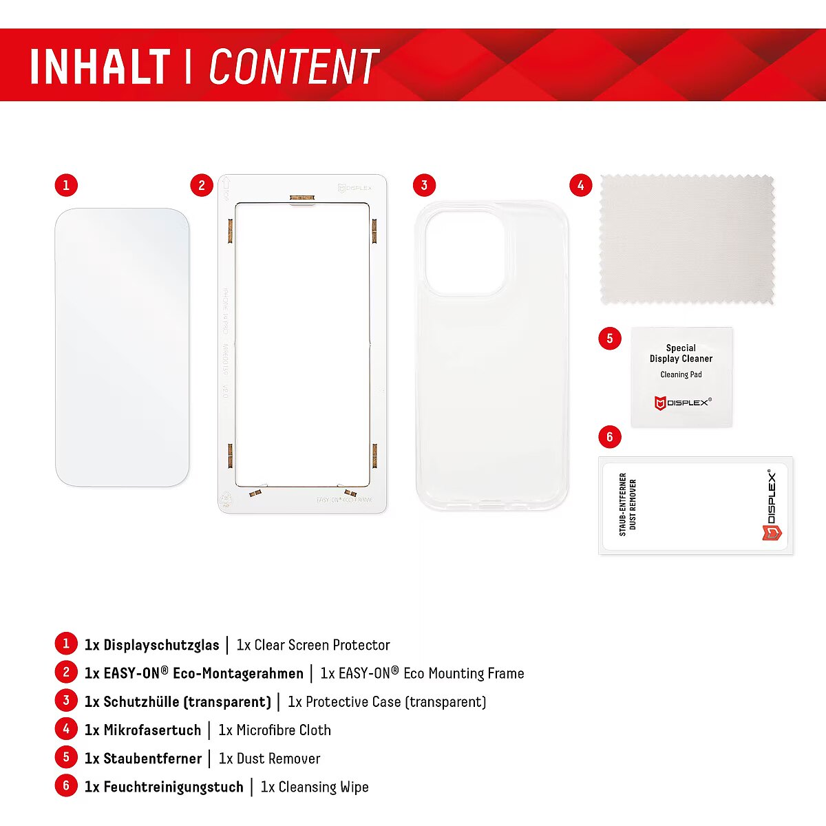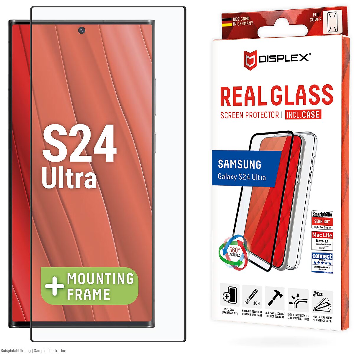 LongDesc - Real Glass (2D) with Case, 360°-Protection with EASY-ON® Eco Mounting Frame Protective case for 360°-protectionOur Displex protective glass is manufactured to within 5/100 mm of the smartphone contours and therefore fits perfectly on your smartphone. In addition, the protective film is ultra-thin at 3mm. This means that the transparent case, that is included in this product, can be used perfectly with the screen protection glass. But also all other standard-sized protective cases can be used with the screen protector. Thus, your smartphone is optimally protected all around by a combined protection of the Displex Tempered Glass and your favourite case. Tempered glass with rounded edgesAll Displex protective glasses have a surface hardness of 10H and are therefore not only more scratch-, break- and shock-resistant than comparable brand products, but even surpass sapphire glass, which is used in luxury watches and has a hardness of 9H.Even the edges, the area of the smartphone and protective glass most susceptible to breakage and impact, are specially hardened, rounded by 4-fold polishing and finished with a shock-absorbing edge. This elaborate production process further increases the protection against knocks and bumps and allows a particularly pleasant use of the smartphone. With these features, the protective glass is extremely resistant and guarantees maximum breakage resistance. Case-friendlyOur Displex protective glass is manufactured to within 5/100 mm of the smartphone contours and therefore fits perfectly on your smartphone. In addition, the protective film is ultra-thin at 3mm. This means that all standard-sized protective cases can be used with the screen protection glass. Thus, your smartphone is optimally protected all around by a combined protection of the Displex Tempered Glass and your favourite case. Anti fingerprint coatingThe top layer of our 4-Layer Technology is a high-tech plasma coating. With an extremely long-lasting effect, this coating effectively repels fingerprints. In addition, the plasma coating guarantees a soft scrolling experience. This technology not only makes your display look better, but it also keeps it cleaner and therefore requires less frequent cleaning. High-tech splinter protectionThe high-tech shatter protection integrated in the Real Glass from Displex guarantees absolute safety even if the protective glass breaks. Thanks to the composite material of the second layer in the protective glass, it does not shatter and thus guarantees absolutely safe use. If the worst should come to the worst and the protective glass has absorbed a blow, fall or impact and is broken, the Displex protective glass can be easily pulled off the display in one piece thanks to the integrated high-tech shatter protection. High-performance adhesiveOnce the protective glass has been fitted, the high-performance adhesive ensures optimum adhesion properties and a clear look. The adhesive is adapted to all display coatings of the various manufacturers so that the protective film for mobile phones holds reliably in the long term. The visual appearance is not affected either: despite the screen protection film, you can enjoy gripping videos and photos with maximum transparency and colour fidelity. Simple & bubble-free applicationWith the EASY-ON® Eco Mounting Frame and the accompanying video tutorials, mounting the tempered glass is incredibly quick, easy and precise. In addition the EASY-ON® Eco Mounting Frame is made of premium solid cardboard and is therefore not only sustainable, but also a 100% recyclable. The result is worth seeing: no crooked positioning of the screen protector on the display, no concealed openings for speakers or microphones and certainly no bubbles under the protective glass.