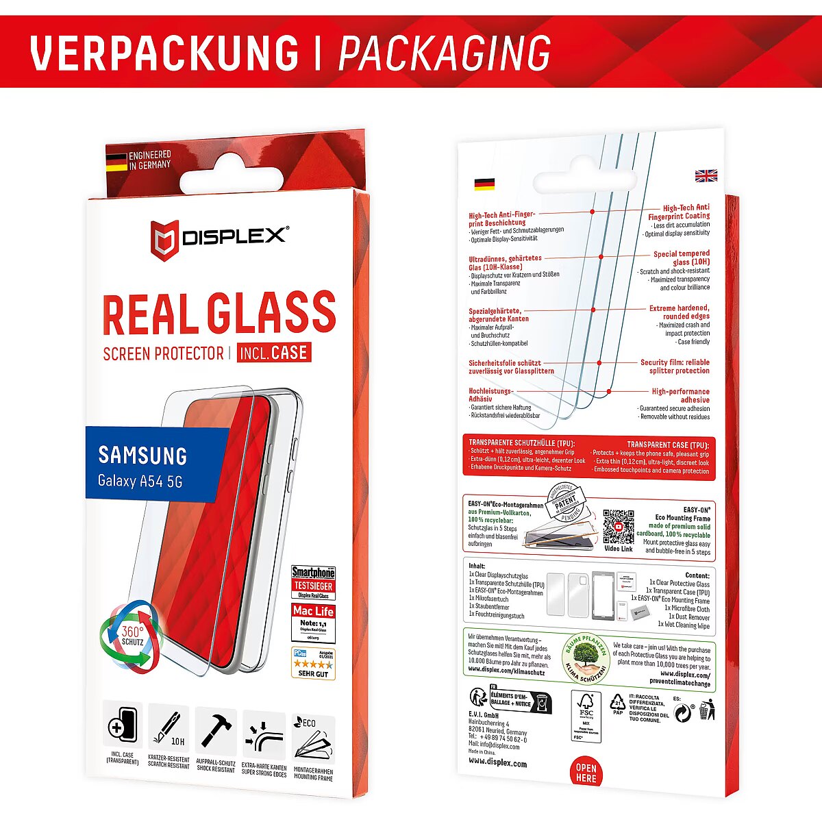 LongSummaryDescription - Displex Screen Protector (10H) + Case for Samsung Galaxy A54 5G, Eco Mounting Frame, + Case, Tempered Glass, scratch resistant protective film. Brand compatibility: Samsung, Compatibility: Galaxy A54 5G. Dry application. Protection features: Impact resistant, Scratch resistant, Dust resistant. Surface finish: Glossy, Material: Tempered glass, Product colour: Transparent. Quantity per pack: 1 pc(s)