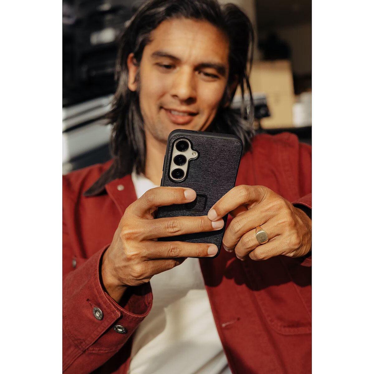 A phone case with the perfect balance of slimness, smart aesthetics, and protection, plus it brilliantly connects to the entire Peak Design Mobile Ecosystem (and MagSafe accessories, too). It's like a tuxedo for your phone—a tuxedo with a slim 2.4 mm profile and protective rubberized bumper, all wrapped in beautiful nylon canvas shell. But what truly sets the Everyday Case apart is the brilliant magnetic/mechanical lock that's built right into it. We call this mounting technology SlimLink™, and it's so fast and secure that it borders on magic. With this case on your phone, you can instantly connect to all Peak Design Mobile mounts, chargers, and accessories. It even works with Apple MagSafe chargers and accessories, too. Unlock the peak design ecosystem Connects to all Peak Design Mobile mounts & accessories Built-in magnetic locking technology (called SlimLink™) is ultra secure and feels like magic Works with MagSafe Compatible with MagSafe accessories & chargers Note that compatibility with all 3rd party chargers (even Qi certified chargers) is not guaranteed Slim & protective Super-slim 2.4mm profile Rubberized full-surround shock-absorbing bumper Protective lip around screen and camera lenses Rugged 2m (6ft) drop protection Better materials = better case Nylon canvas fabric shell is weatherproof, 100% recycled, and Bluesign-approved Ultralight polycarbonate body Works with peak design straps 2 mounting points for Peak Design Anchors let you tether/carry your phone with any Peak Design strap S-Pen Compatibility Note: For the S23 and S24 models, you are able to use the S-Pen, with a possibility of slight interference around the magnets in the case. On S21 and S22 Cases, use of the Samsung S-Pen stylus accessory is not possible while your phone is in the case due to the magnets in the case PowerShare Compatibility Note: Use of the PowerShare feature (wireless power sharing between phones) is also not possible on S21 and S22 models when your phone is in this case.