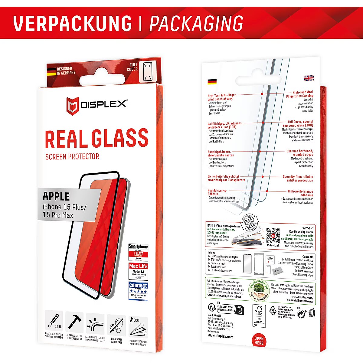 Displex Full Cover Schutzglas für Iphone 15 Pro Max/15 Plus Eco-Montagerahmen, volle Displayabdeckung, Tempered Glas, kratzer-resistente Schutzfolie,
