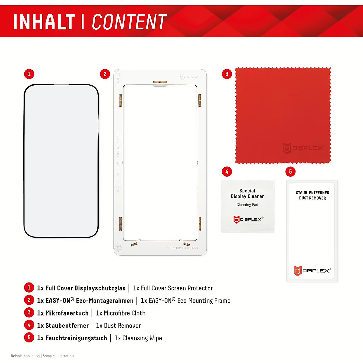LongDesc - Full Cover or 3D/ Curved Real Glass with EASY-ON® Eco Mounting Frame Full screen coverageCompared to the so-called 2D protective glasses, Displex Full Cover protective glasses cover not only the active display area, but the entire display area. This means optimum protection of the entire display and an improved user experience: maximum protection without annoying edges.This feature is particularly advantageous for smartphones with rounded displays. Since the screen protector adapts perfectly to the rounded display and thus protects the entire display area. Tempered glass with rounded edgesAll Displex protective glasses have a surface hardness of 10H and are therefore not only more scratch-, break- and shock-resistant than comparable brand products, but even surpass sapphire glass, which is used in luxury watches and has a hardness of 9H.Even the edges, the area of the smartphone and protective glass most susceptible to breakage and impact, are specially hardened, rounded by 4-fold polishing and finished with a shock-absorbing edge. This elaborate production process further increases the protection against knocks and bumps and allows a particularly pleasant use of the smartphone. With these features, the protective glass is extremely resistant and guarantees maximum breakage resistance. Case-friendlyOur Displex protective glass is manufactured to within 5/100 mm of the smartphone contours and therefore fits perfectly on your smartphone. In addition, the protective film is ultra-thin at 3mm. This means that all standard-sized protective cases can be used with the screen protection glass. Thus, your smartphone is optimally protected all around by a combined protection of the Displex Tempered Glass and your favourite case. Anti fingerprint coatingThe top layer of our 4-Layer Technology is a high-tech plasma coating. With an extremely long-lasting effect, this coating effectively repels fingerprints. In addition, the plasma coating guarantees a soft scrolling experience. This technology not only makes your display look better, but it also keeps it cleaner and therefore requires less frequent cleaning. High-tech splinter protectionThe high-tech shatter protection integrated in the Real Glass from Displex guarantees absolute safety even if the protective glass breaks. Thanks to the composite material of the second layer in the protective glass, it does not shatter and thus guarantees absolutely safe use. If the worst should come to the worst and the protective glass has absorbed a blow, fall or impact and is broken, the Displex protective glass can be easily pulled off the display in one piece thanks to the integrated high-tech shatter protection. High-performance adhesiveOnce the protective glass has been fitted, the high-performance adhesive ensures optimum adhesion properties and a clear look. The adhesive is adapted to all display coatings of the various manufacturers so that the protective film for mobile phones holds reliably in the long term. The visual appearance is not affected either: despite the screen protection film, you can enjoy gripping videos and photos with maximum transparency and colour fidelity. Simple & bubble-free applicationWith the EASY-ON® Eco Mounting Frame and the accompanying video tutorials, mounting the tempered glass is incredibly quick, easy and precise. In addition the EASY-ON® Eco Mounting Frame is made of premium solid cardboard and is therefore not only sustainable, but also a 100% recyclable. The result is worth seeing: no crooked positioning of the screen protector on the display, no concealed openings for speakers or microphones and certainly no bubbles under the protective glass.
