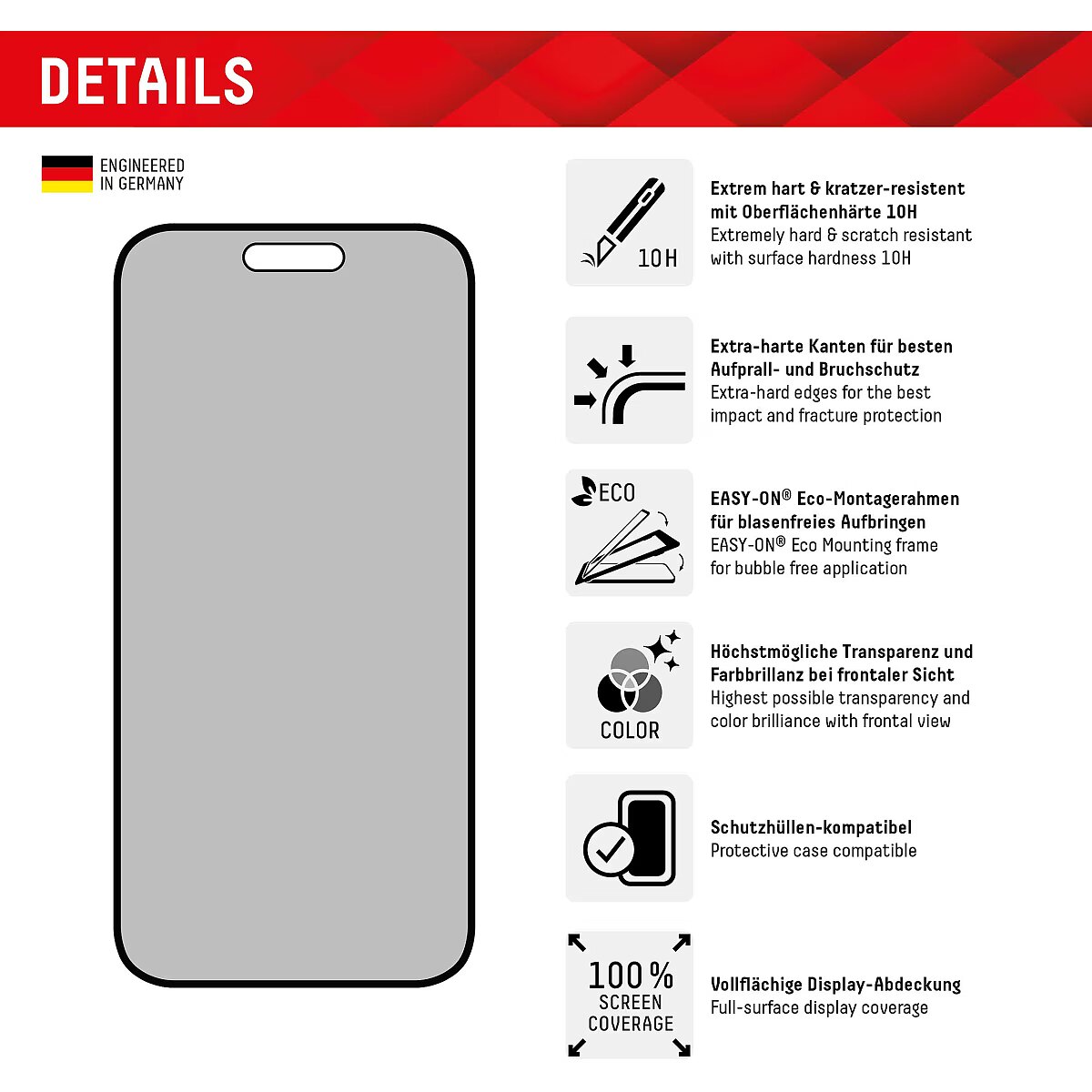 LongProductName - DISPLEX Privacy Full Cover Screen Protector (10H) for Apple iPhone 15/15 Pro, Eco Mounting Frame, Privacy Filter, Tempered Glass, scratch resistant protective film, case friendly