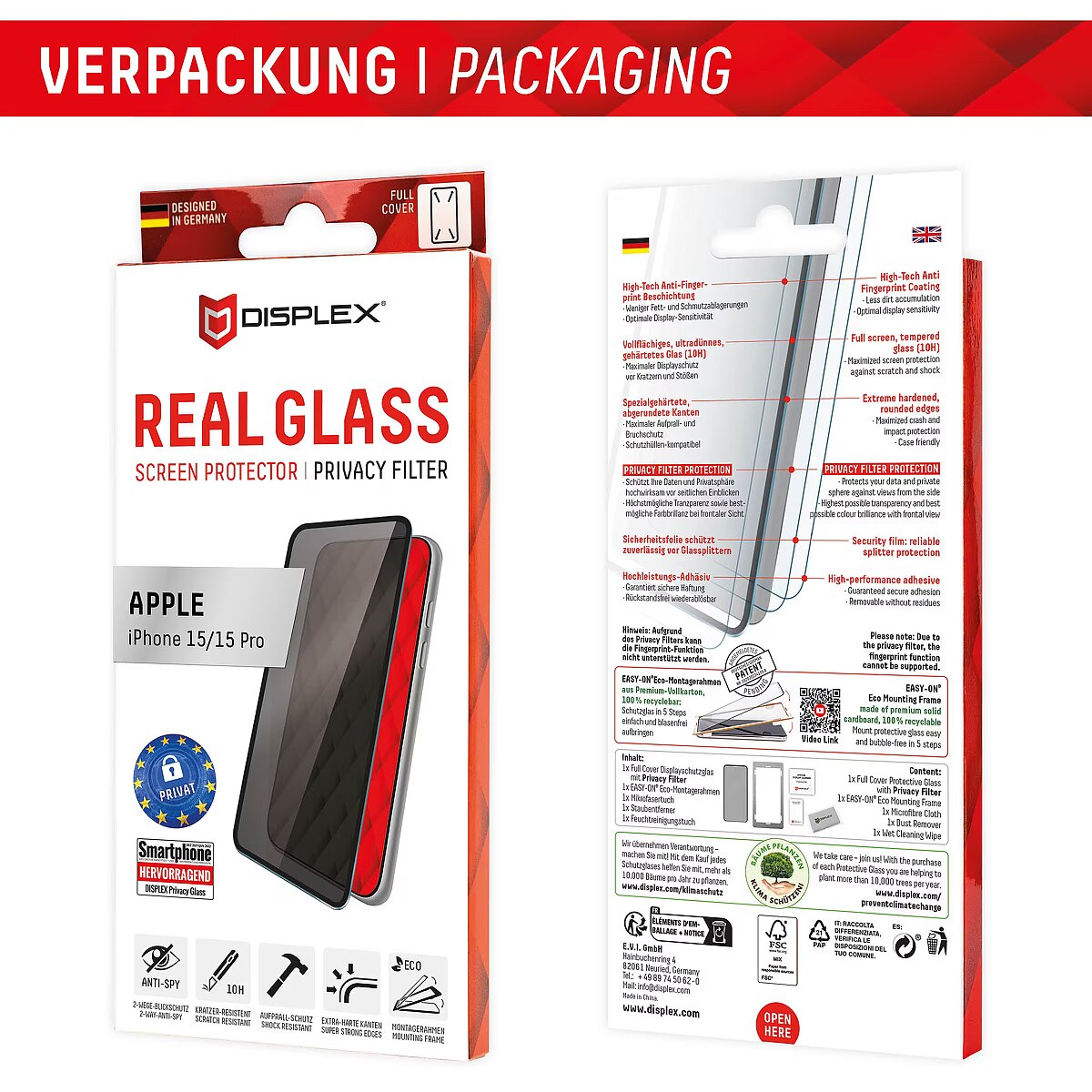 LongSummaryDescription - Displex Privacy Screen Protector (10H) for Apple iPhone 15/15 Pro, Eco Mounting Frame, Privacy Filter. Brand compatibility: Apple, Compatibility: Apple iPhone 15, Apple iPhone 15 Pro. Dry application. Protection features: Impact resistant, Scratch resistant, Dust resistant. Privacy filtering function, Material: Tempered glass, Product colour: Transparent. Quantity per pack: 1 pc(s)