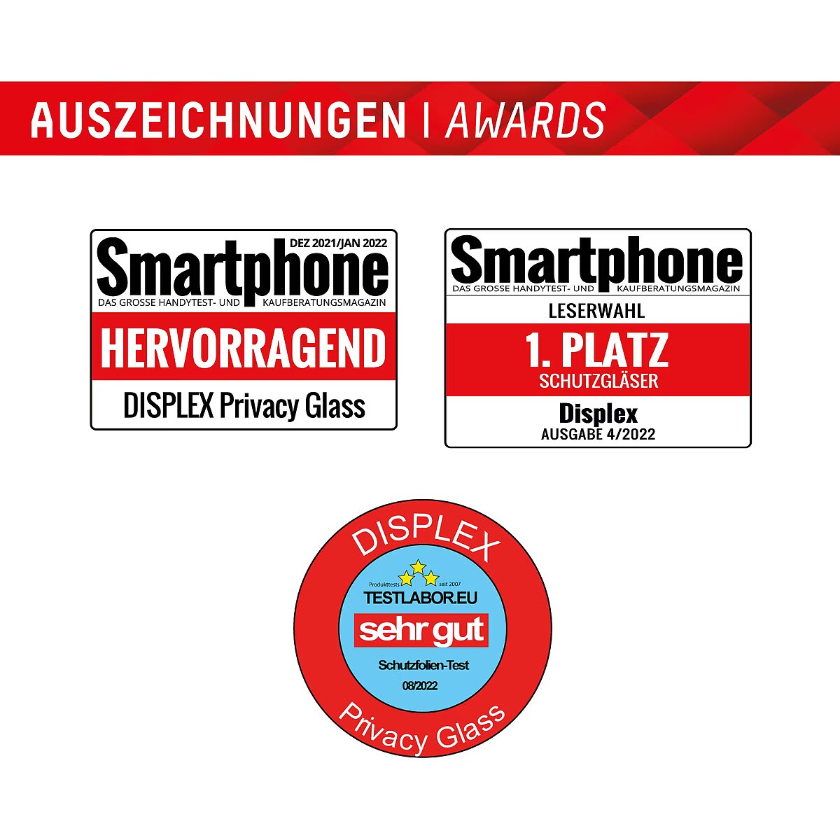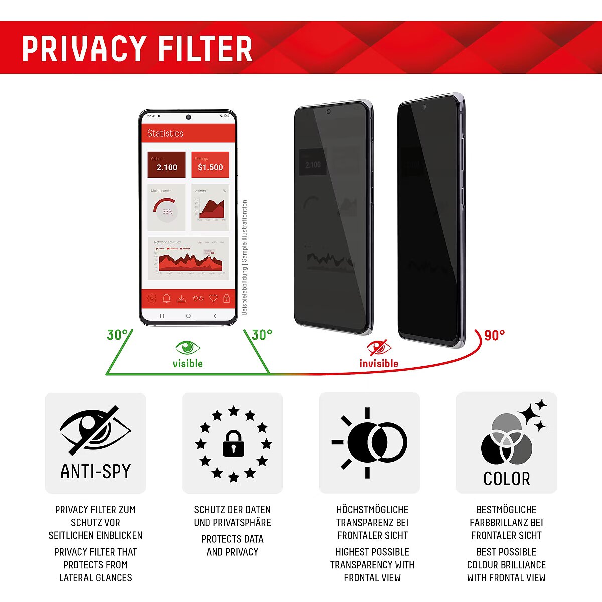 LongDesc - PRIVACY Full Cover Real Glass with EASY-ON® Eco Mounting Frame Privacy FilterThanks to the special privacy filter integrated into the protective glass, the display light is only transmitted from a certain viewing angle. This means that the screen appears black from a viewing angle of 30° or more. The glass thus offers effective protection against side glances from, for example, seat neighbours on trains, planes or buses. And all of this, of course, without any negative impact on colour fidelity or display quality. So if you use your smartphone to store and edit sensitive data - whether for business or private use - the Privacy Glass is an option worth considering. Full screen coverageCompared to the so-called 2D protective glasses, Displex Full Cover protective glasses cover not only the active display area, but the entire display area. This means optimum protection of the entire display and an improved user experience: maximum protection without annoying edges.This feature is particularly advantageous for smartphones with rounded displays. Since the screen protector adapts perfectly to the rounded display and thus protects the entire display area. Tempered glass with rounded edgesAll Displex protective glasses have a surface hardness of 10H and are therefore not only more scratch-, break- and shock-resistant than comparable brand products, but even surpass sapphire glass, which is used in luxury watches and has a hardness of 9H.Even the edges, the area of the smartphone and protective glass most susceptible to breakage and impact, are specially hardened, rounded by 4-fold polishing and finished with a shock-absorbing edge. This elaborate production process further increases the protection against knocks and bumps and allows a particularly pleasant use of the smartphone. With these features, the protective glass is extremely resistant and guarantees maximum breakage resistance. Case-friendlyOur Displex protective glass is manufactured to within 5/100 mm of the smartphone contours and therefore fits perfectly on your smartphone. In addition, the protective film is ultra-thin at 3mm. This means that all standard-sized protective cases can be used with the screen protection glass. Thus, your smartphone is optimally protected all around by a combined protection of the Displex Tempered Glass and your favourite case. Anti Fingerprint The top layer of our 5-Layer Technology consists of a high-tech plasma coating. The hydrophobic anti-fingerprint coating is grease and dirt repellent, extremely long-lasting and ensures optimal touch and scrolling. This technology not only makes your display look better, it also keeps it clean longer, so it requires less frequent cleaning. High-tech splinter protectionThe high-tech shatter protection integrated in the Real Glass from Displex guarantees absolute safety even if the protective glass breaks. Thanks to the composite material of the second layer in the protective glass, it does not shatter and thus guarantees absolutely safe use. If the worst should come to the worst and the protective glass has absorbed a blow, fall or impact and is broken, the Displex protective glass can be easily pulled off the display in one piece thanks to the integrated high-tech shatter protection. High-performance adhesiveOnce the protective glass has been fitted, the high-performance adhesive ensures optimum adhesion properties and a clear look. The adhesive is adapted to all display coatings of the various manufacturers so that the protective film for mobile phones holds reliably in the long term. The visual appearance is not affected either: despite the screen protection film, you can enjoy gripping videos and photos with maximum transparency and colour fidelity. Simple & bubble-free applicationWith the EASY-ON® Eco Mounting Frame and the accompanying video tutorials, mounting the tempered glass is incredibly quick, easy and precise. In addition the EASY-ON® Eco Mounting Frame is made of premium solid cardboard and is therefore not only sustainable, but also a 100% recyclable. The result is worth seeing: no crooked positioning of the screen protector on the display, no concealed openings for speakers or microphones and certainly no bubbles under the protective glass.