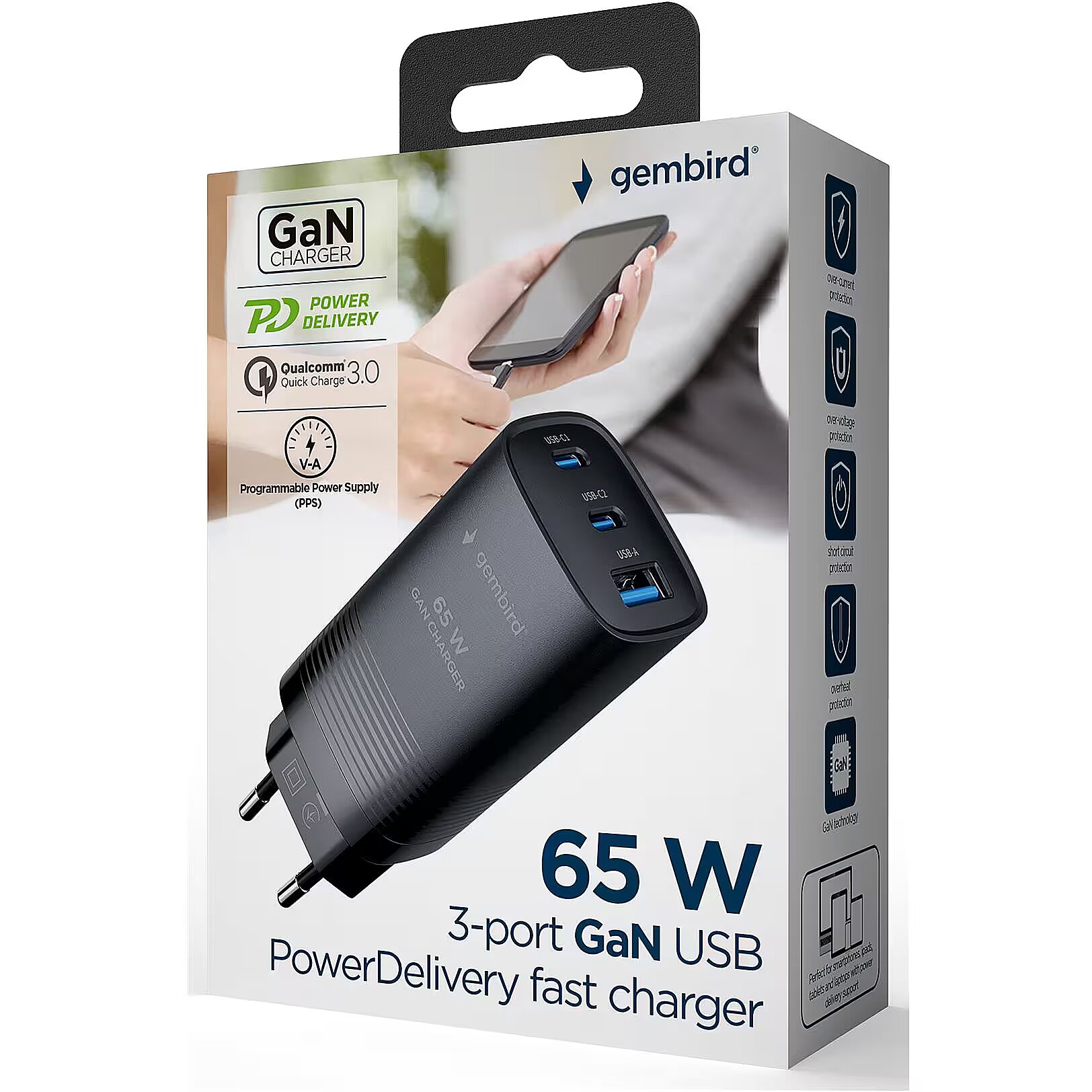 Name - Cablexpert 3-port 65 W GaN USB PowerDelivery fast charger | TA-UC-PDQC65-01-BK