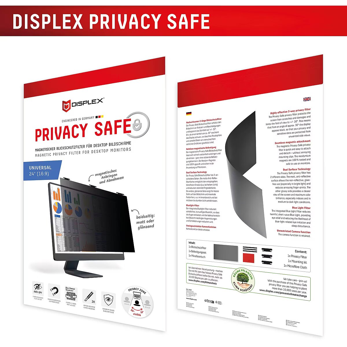 LongSummaryDescription - Displex PRIVACY SAFE removable 2-way privacy filter for Desktop Monitor 24'' (16:9). Maximum screen size: 61 cm (24"). Aspect ratio: 16:9. Suitable for: Monitor, Type: Frameless display privacy filter. Surface finish: Glossy / Matt, Hardness: 3H, Limits viewing angle: 30°